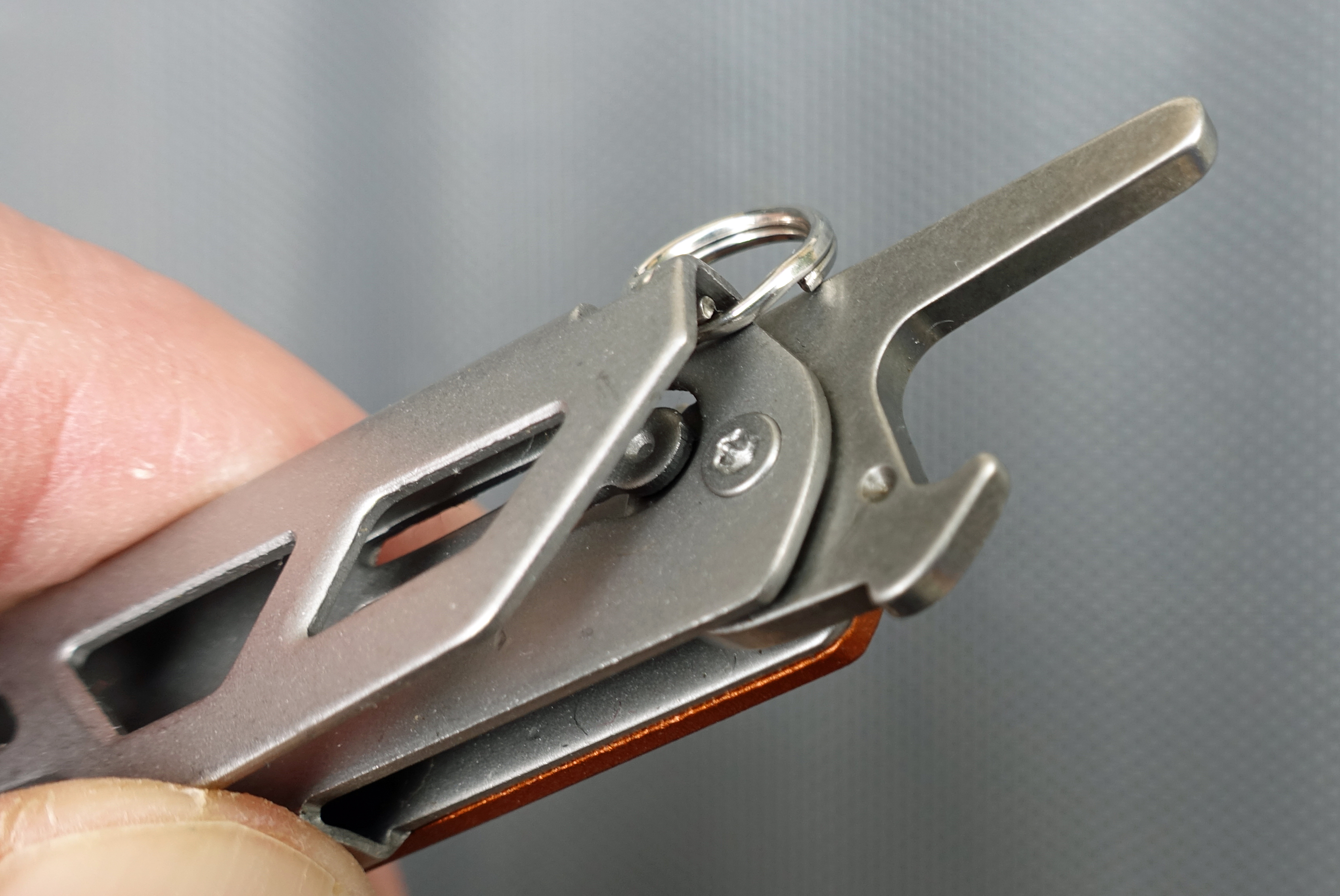 The exact same cap lifter/bottle opener is found on both Armbar Slim Cut and Slim Drive. This is a great deal narrower than the one found on the full size Armbar Drive, and that one was probably the best found on any small multi-tool. The opener found on both Slim models does work, after a fashion. Note the small split ring passed through a hole in the frame on both these tools next to the cap lifter, this is the so-called key ring.