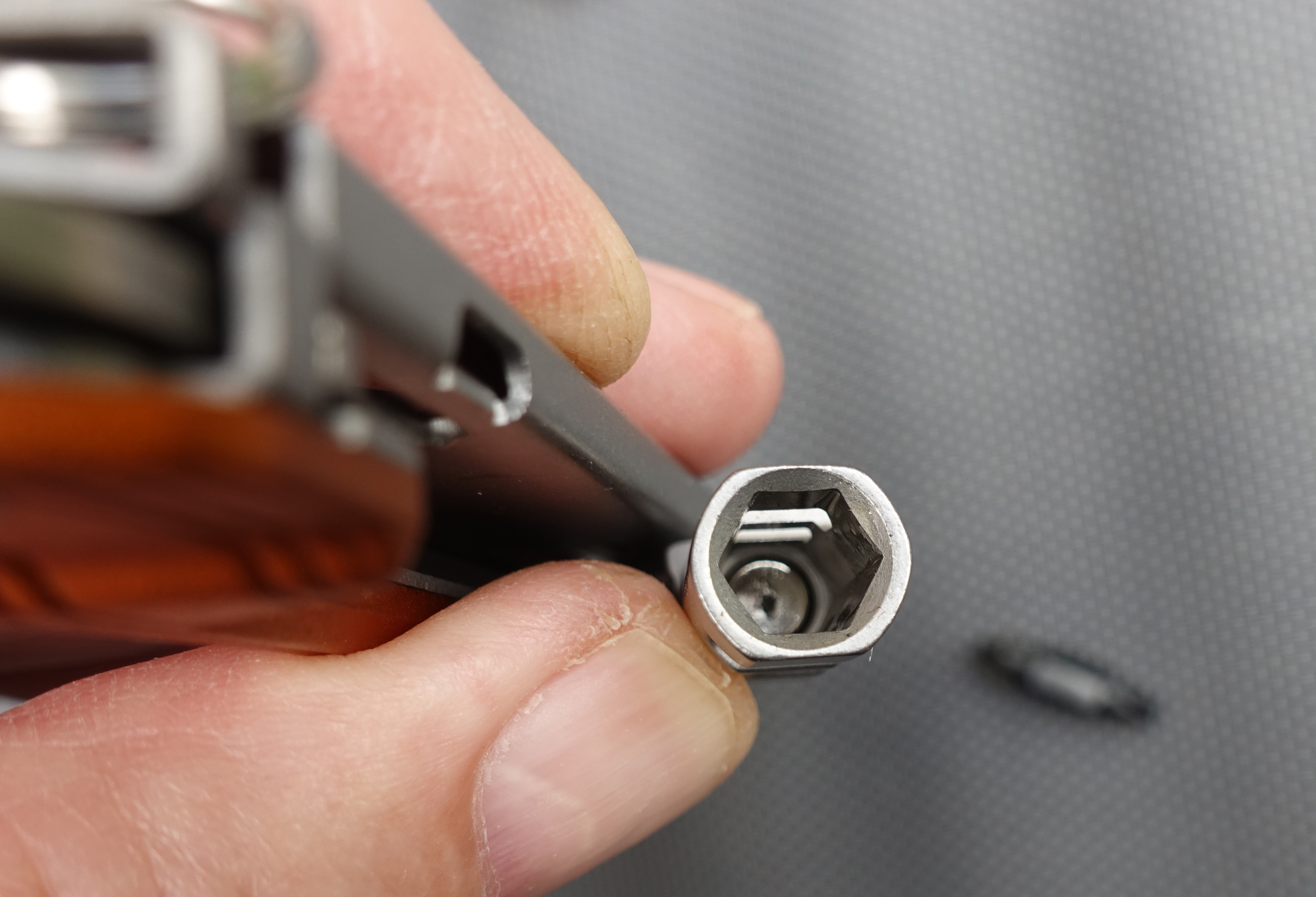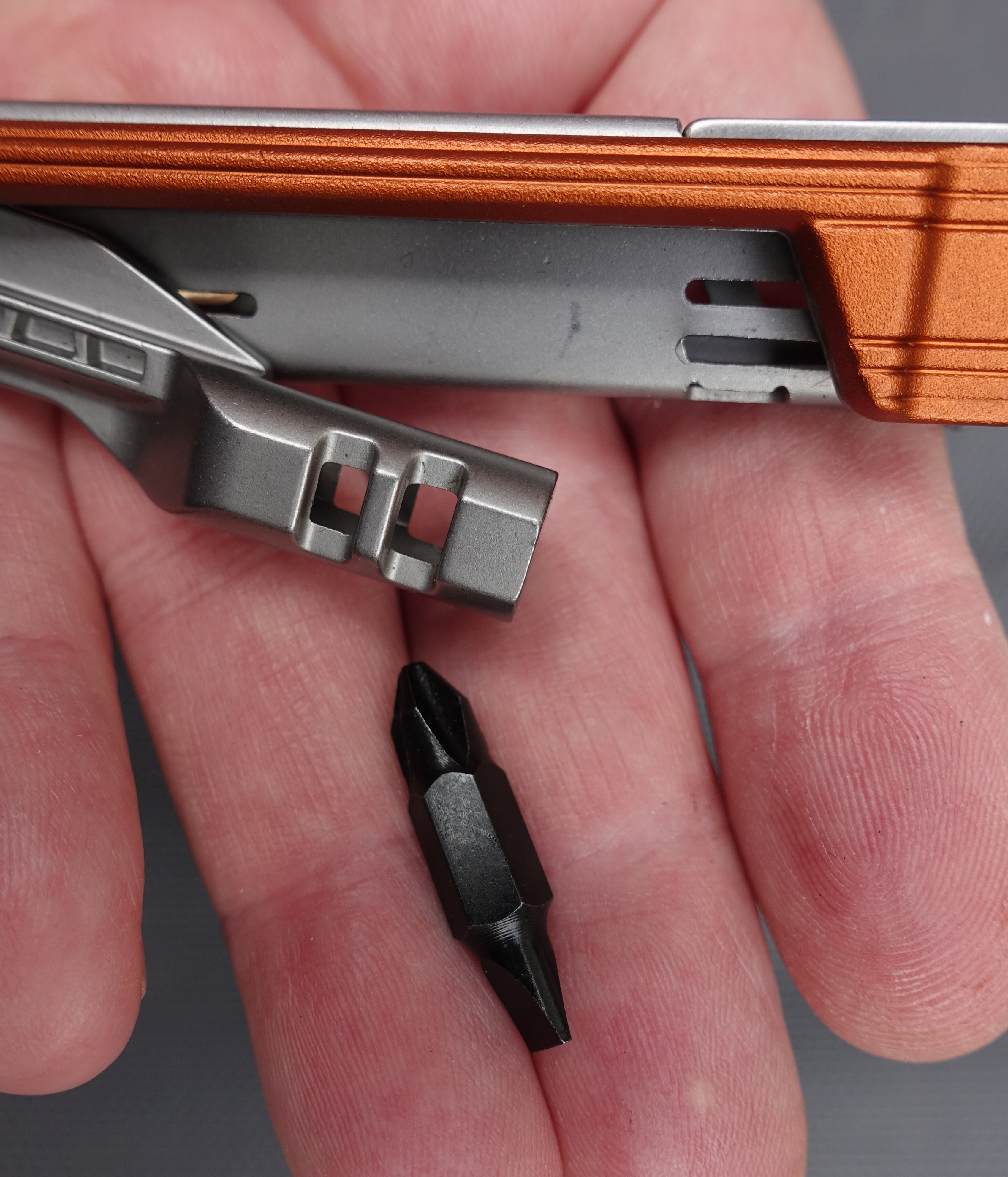 The hex driver found on the Slim Drive has pluses and one big minus. In it’s favour, it folds away neatly into a small package and provides a 50mm extended drive capability. There is a small rare earth magnet secreted in the driver base to securely hold bits. On the negative side, other than being able to hold a two-ended mini bit, there is no facility to store another bit anywhere on the tool. The biggest problem with this tool is that the hex drive has no lock when open. There is the lightest of snaps as it fully opens, but not enough to hold it. Under torque and sideways pressure, it will want to fold while in use. The drive can also be folded to the ninety degree angle to provide a little more twisting torque when in use. Though again, not locked while doing so.