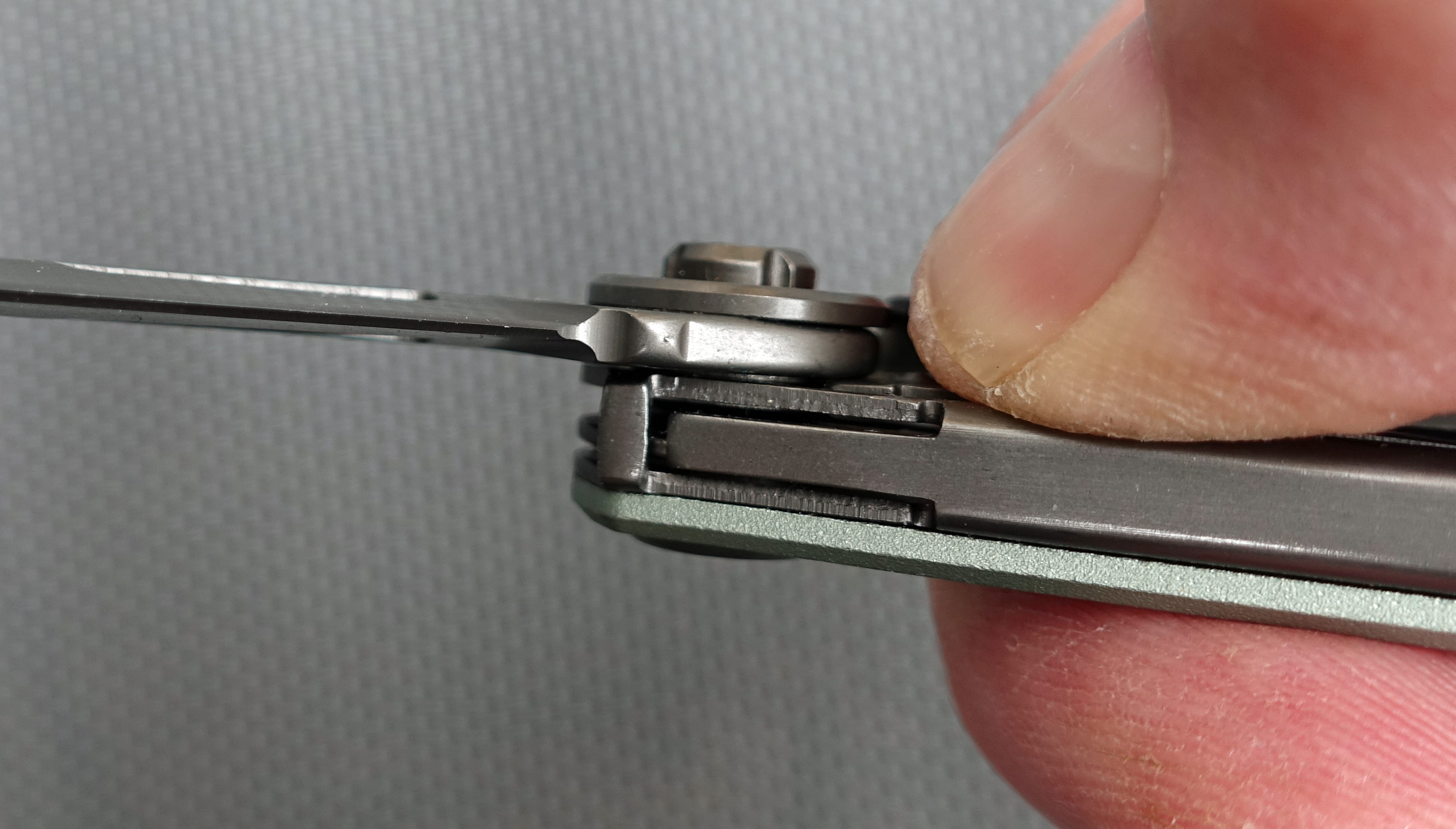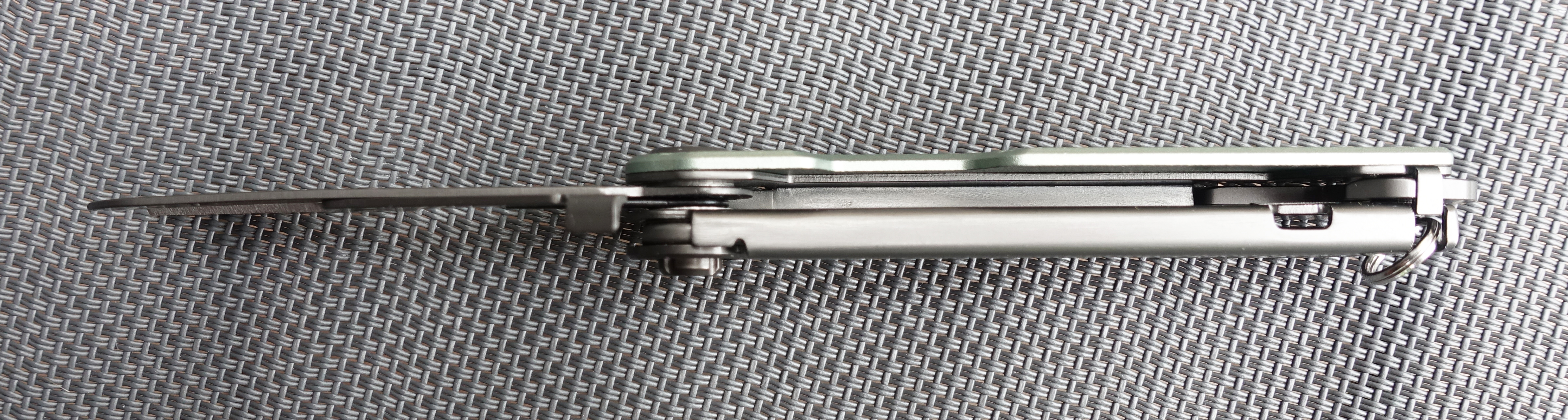 The plain edge blade is 70mm long with a 66mm cutting edge. Made of 5CR15MOV stainless steel, the modified sheep’s foot design has a slight rise toward the end of the blade tip that provides a decent length of blade for chopping and slicing food on trail. The blade is quite chunky in appearance- it is 15.55mm deep and 2.70mm thick across the spine. With such a thick spine and a decent large pivot, there is no noticeable side flex and the knife exhibits no sloppiness in use.