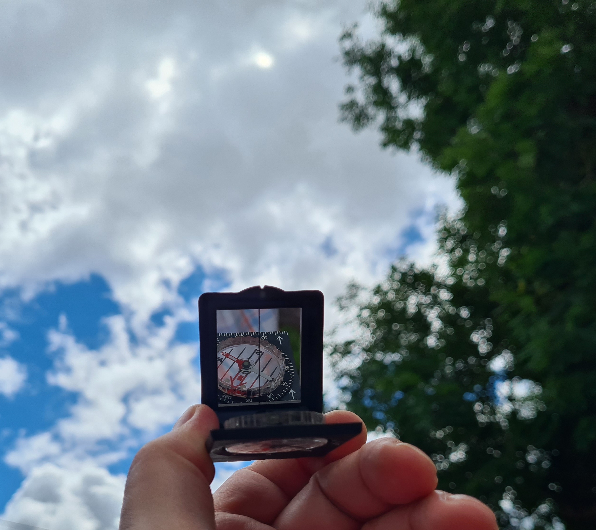Sight toward the sun with the sighting notch on the top of the lid housing. Even on a partially cloudy day, the sun can frequently be seen through the clouds