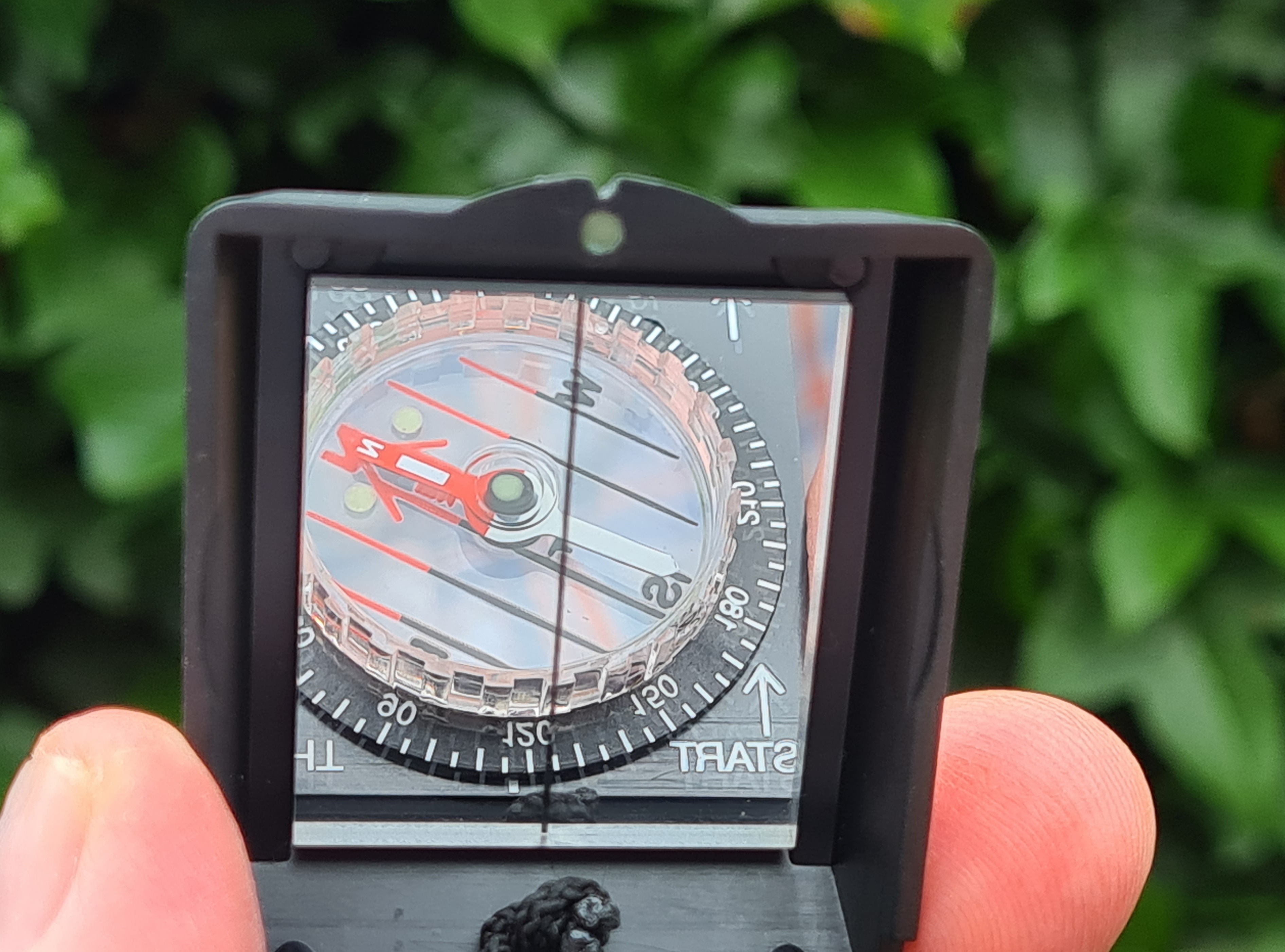 With the lid closed to forty-five degrees, the compass needle can be seen in the mirror. Keeping the compass level and maintaining the direction in which the compass is pointing, rotate the compass housing until the compass needle is sitting in the red gate of the housing arrow in the centre of the orienting lines