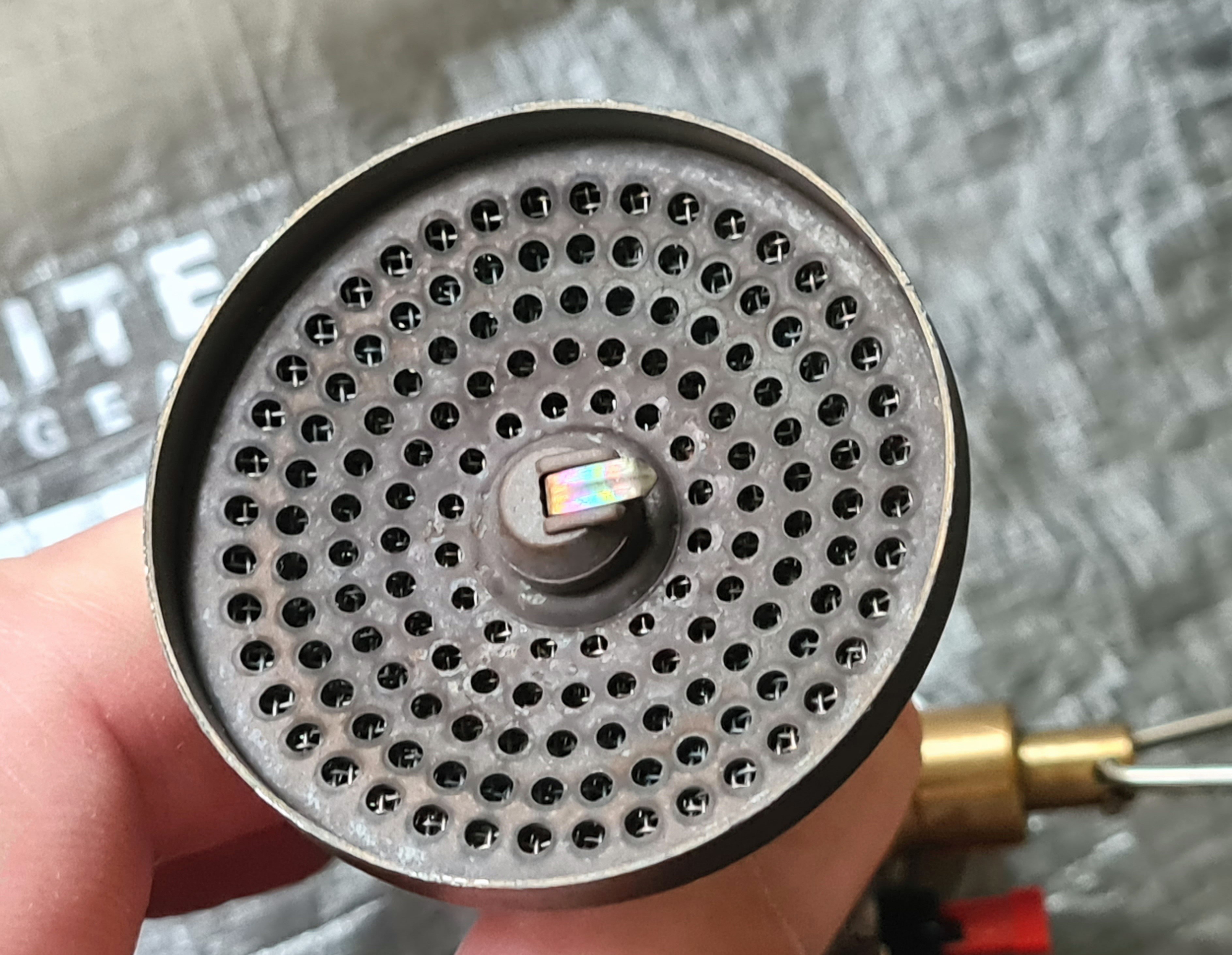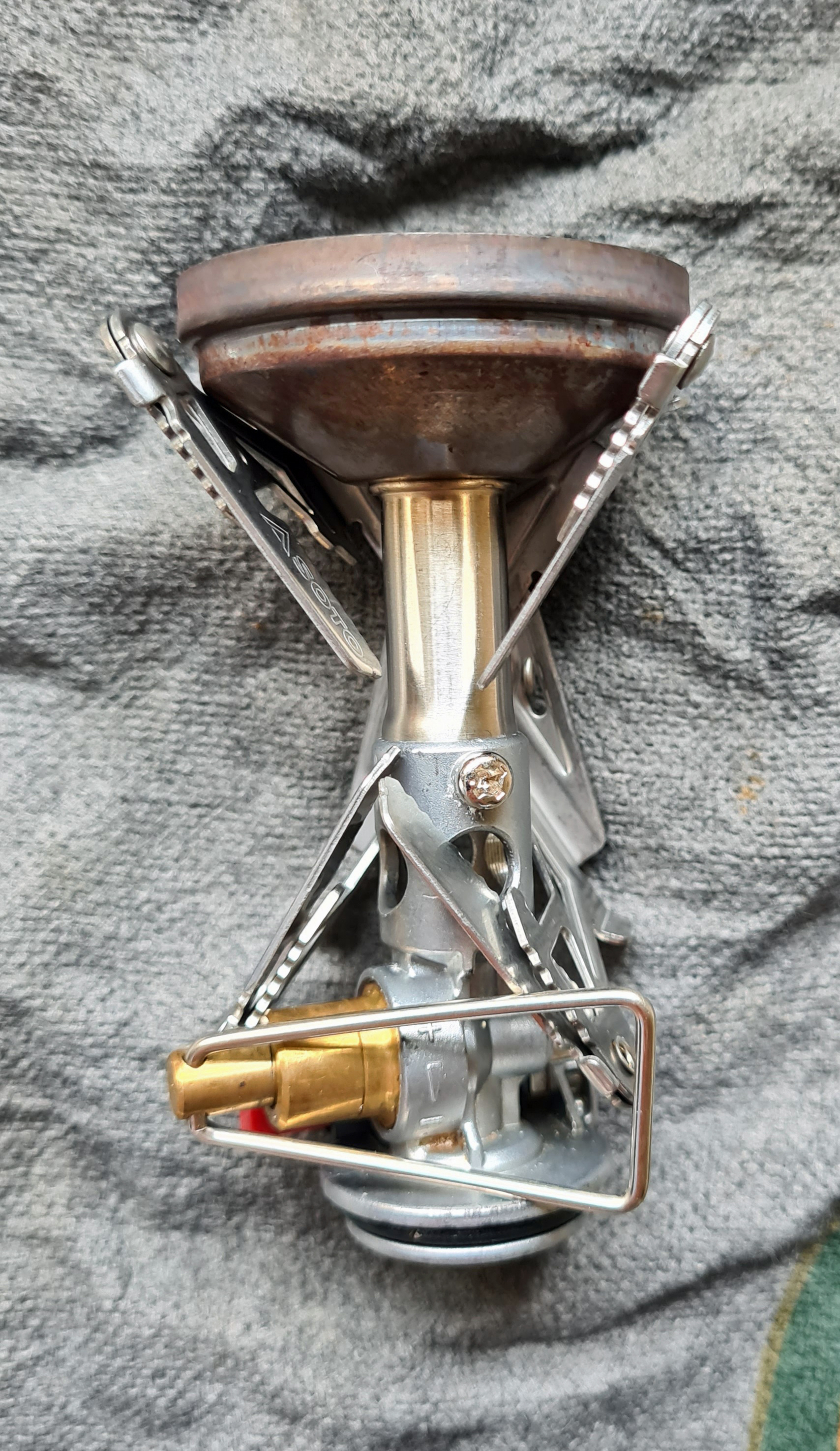 You may have noticed the features that give the Windmaster its name. The large number of burner jets are set below a surrounding protective ring. This ring checks much of the side breeze that will cause a flame to drift. Additionally, the pot supports are low, meaning that a pan or pot sits closer to the burner head with only a small gap between the two. It isn’t perfect of course and some form of simple windshield will obviously assist still further. I usually put my pack on its side upwind and that is suffice. Alternatively, cooking, with care, in the vestibule of my shelter suffices. Also note the wire mesh that sits below the burner jets. In operation this glows red with heat and will, to an extent, reignite a flame extinguished by wind.