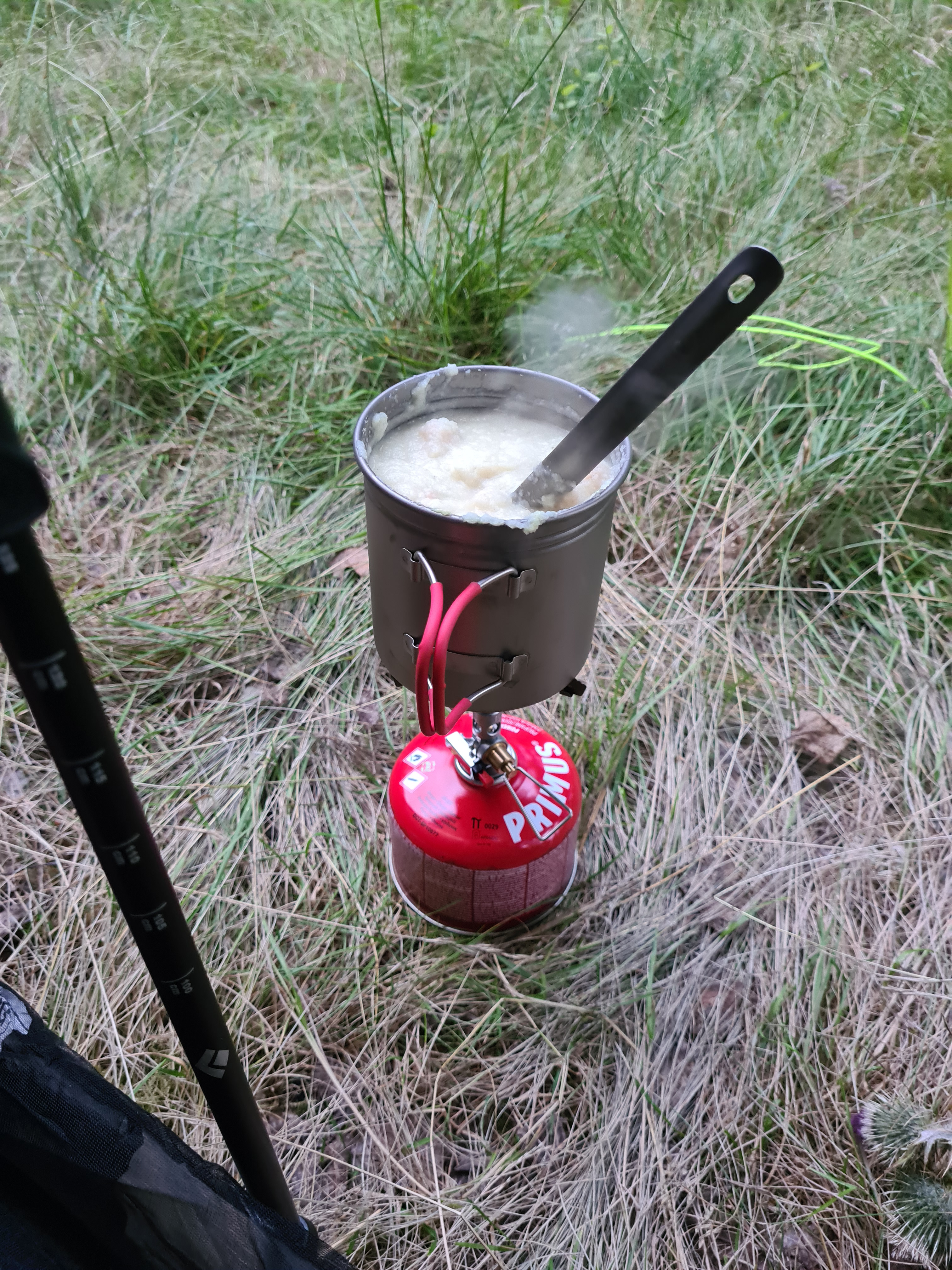 The TriFlex weighs 7g, bringing the total stove weight to 67g. This is a reduction of 19g on the 4Flex option. The similar MSR Pocket Rocket Deluxe weighs 85g. I like that I was able to choose a lighter and slightly less bulky option of pot support that suited my requirements, but I am not the biggest fan of having separate pot support arms. Many is the time I left it on the shelter floor or worse, on the grass outside, and it took a bit of searching to find it. On one day hike I forgot to even take it with me and had to crouch, holding the pot by its handles, over the naked burner head while the water heated. Unpacking at home I then found that I had packed it in the food bag after all. To negate this issue. I now loop it onto a small length of cord that holds my fire steel and little knife together. I only take it off this when I am about to fit it to the burner head and immediately return it to this as soon as I remove it after use. This seems to have solved my mislaying it.