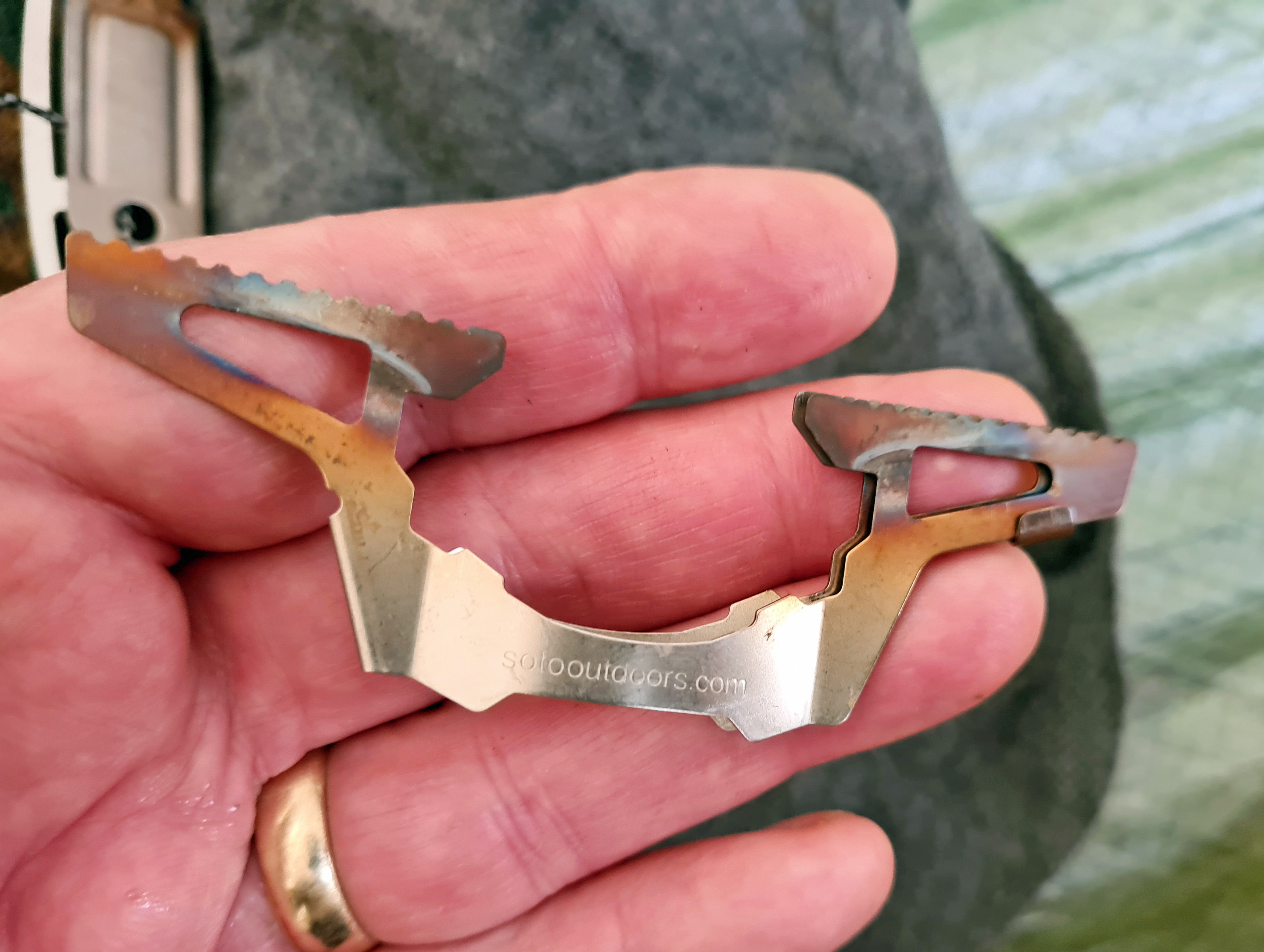 The little Triflex support is clipped closed when not fitted. To fit it is simple. Unclip, and two arms spring apart, and slide over the burner head, ensuring the three hooks are properly gripping the burner crown. Pot supports will be at 120° to each other. The Triflex has support diameters from a minimum of 34mm to an extreme of 100mm, though obviously a pan can overhang this.