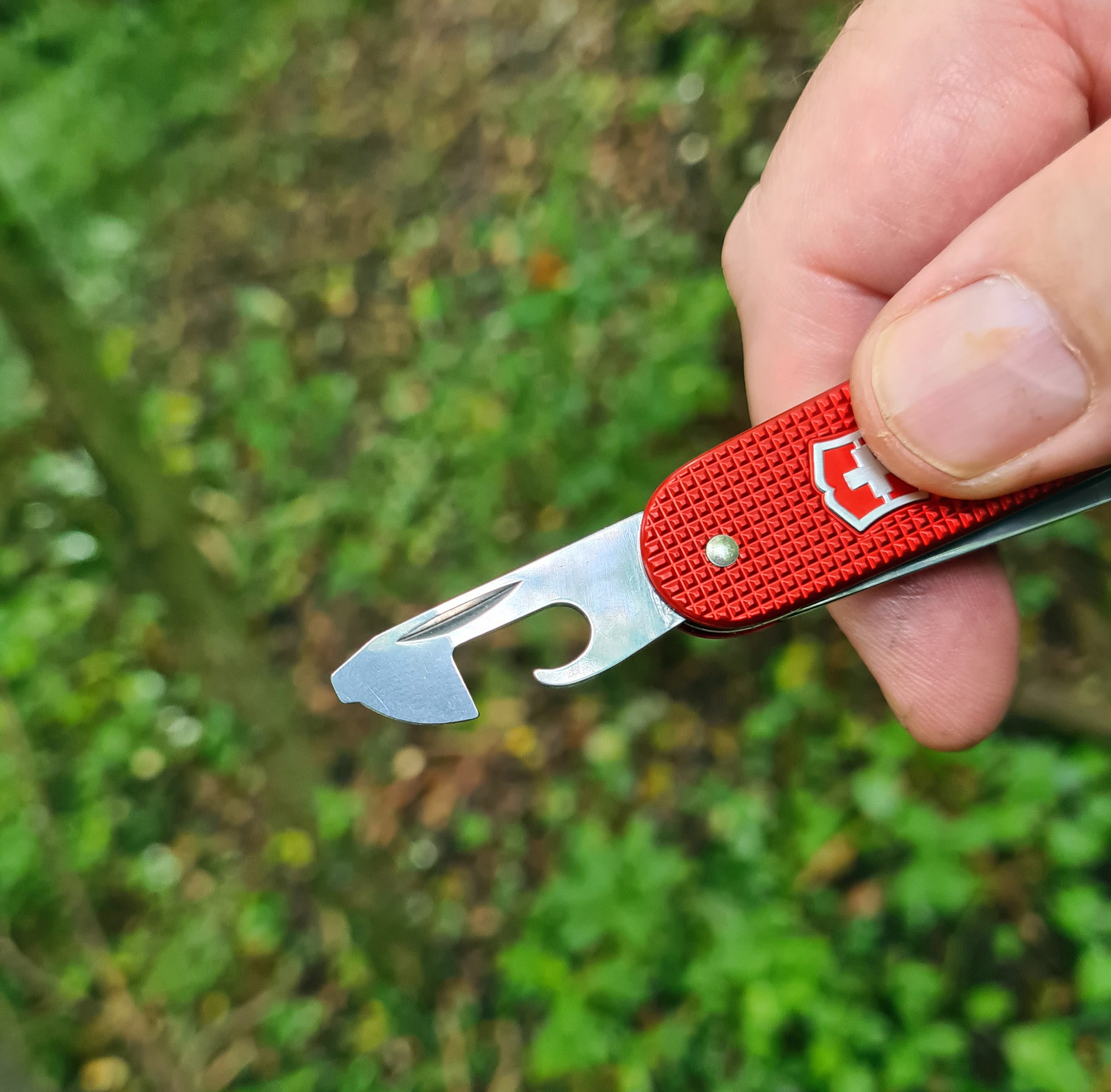 The 63mm spear point blade has a 53mm cutting edge. This measures 2.05mm across the spine and there is little sideways flex of note. You can see in the image above that the blade shape is offset, tapering more on one side than the other to allow the combination tool to sit alongside it when both are folded and closed into the alox scales. While this design probably affects the blade in use, I must confess that I don’t notice it when it is open or when used. The steel is Victorinox’s proprietary ‘stainless’ steel that resists corrosion well, has a degree of carbon content, comes sharp out of the box, retains a edge ‘quite’ well, but is easily sharpened when inevitably dulled. Both tools open and close with a nice ‘snap’ and the blade does not lock open, making this slip-joint knife UK legal.