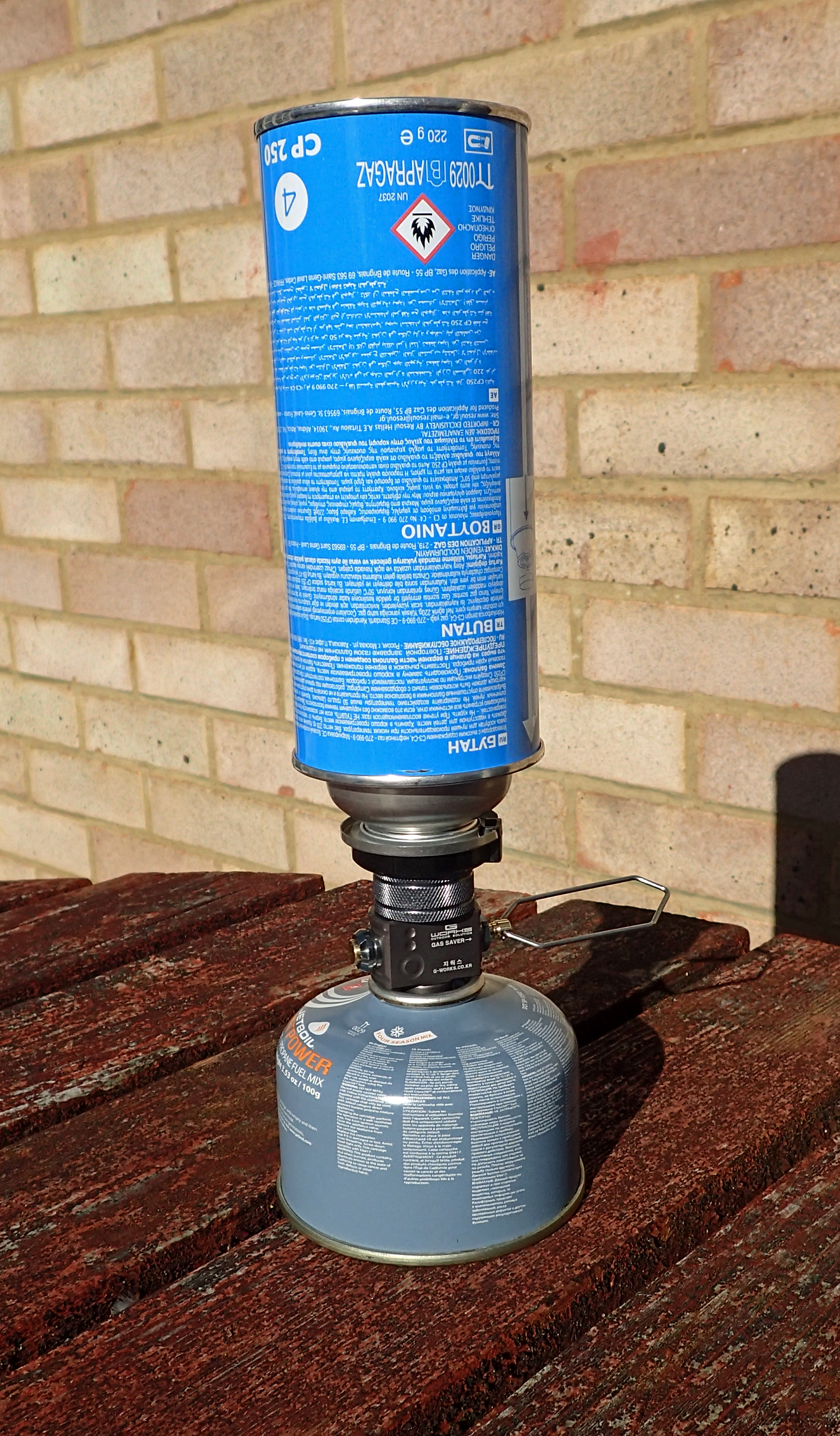 Refilling from one of the thin butane cartridges available from many outlets other than outdoor gear retailers is a cheap way of refilling canisters for warm weather use. While gas will transfer between the two canisters in a vertical orientation, G-Works informs us that if transferring from one of the thin bayonet type connector butane cartridges, then as the uppermost container empties, an angle of at least 45% is optimum, keeping the groove of the cartridge, attached to the adapter, facing downward. I must confess that I simply leave mine in the vertical position and do not seem to have had any issues so far.