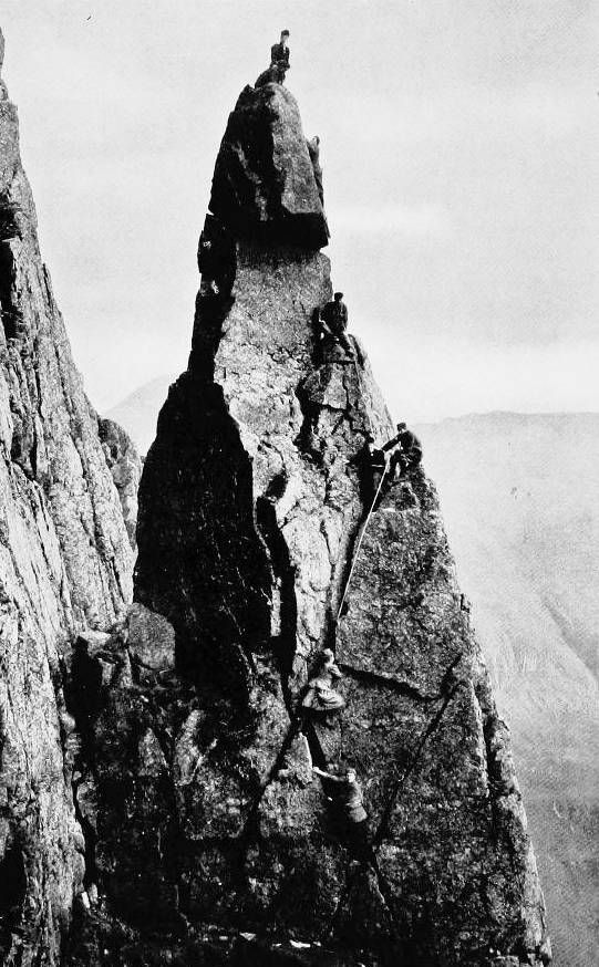 “… others have an idea that in some way the rope is thrown up somewhere, and the climbers swarm up it. In fact we are supposed to rival the wonderful Indian fakirs who, so travellers say, take a coil of rope, throw it into mid-air, climb up it, and then pull the loose end after them. Unfortunately, this is a lost art in Europe at the present day, and we have to content ourselves with more ordinary methods.“