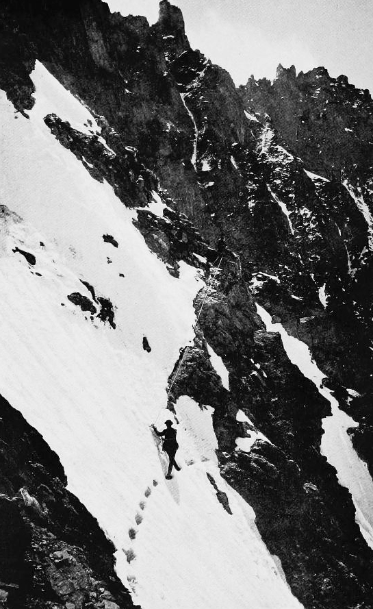 “the slope did not belie its appearance, but the impetus gained above was sufficient to sweep me over the easier part, and I made a precipitate acquaintance with the screes beyond the snow. But the end was not yet. The sudden stop caused me to describe an undignified series of somersaults in mid-air, during which performance my ice- axe arose and smote me between the eyes. Then there was peace for a time. My next view of the snow-slope was some minutes later when consciousness returned, and I discerned my companions hurrying downwards. My wounded forehead bled profusely, and no doubt my friends’ worried looks were fully warranted, for the sight must have been a gory one. Strange to say no bones were broken, but for several days I felt like a mass of bumps and bruises.“