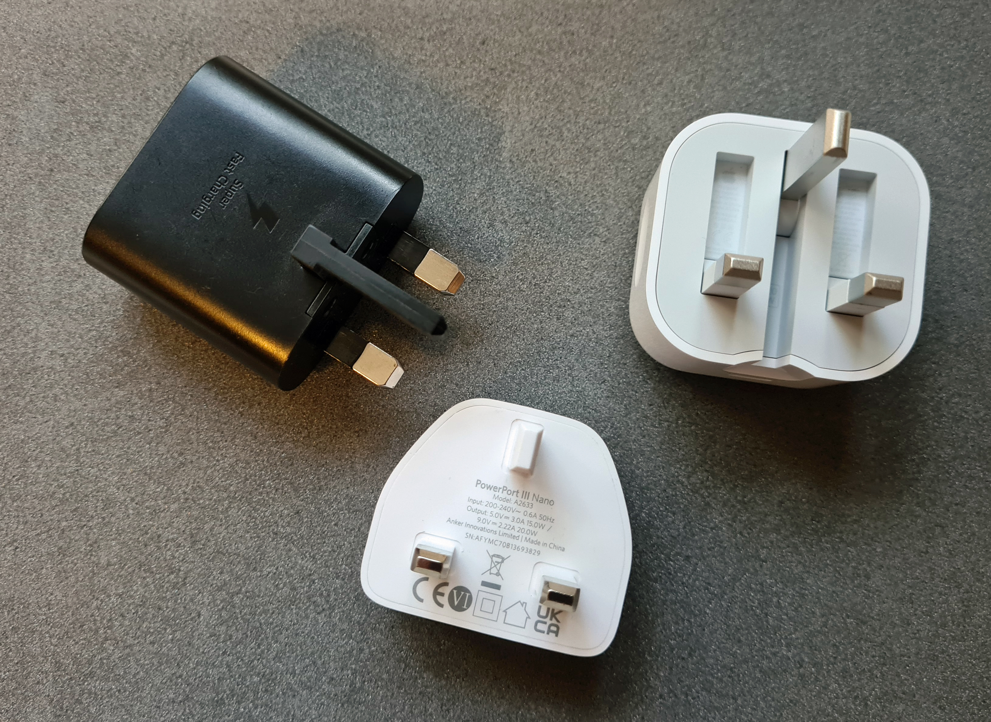 I have one lighter offering that is still capable of delivering a high charge rate and still supplies my preferred USB-C port. This is the relatively diminutive Anker USB-C 20W Power Port III Nano, model A2633, this power adapter with PIQ 3.0 is non-folding but has a much smaller body than both Samsung and Apple products. Dimensions are 41mm x 48mm x (20mm) actual 43mm, that final measurement sounds worse than it is due to the three fixed protruding prongs At just 48g it is the lightest of the three power adapters by far. However the three protruding pins are obtrusive and ‘pokey’, they are always attempting to force themselves through the sides of my electronics pouch. Manufacturer specifications are: