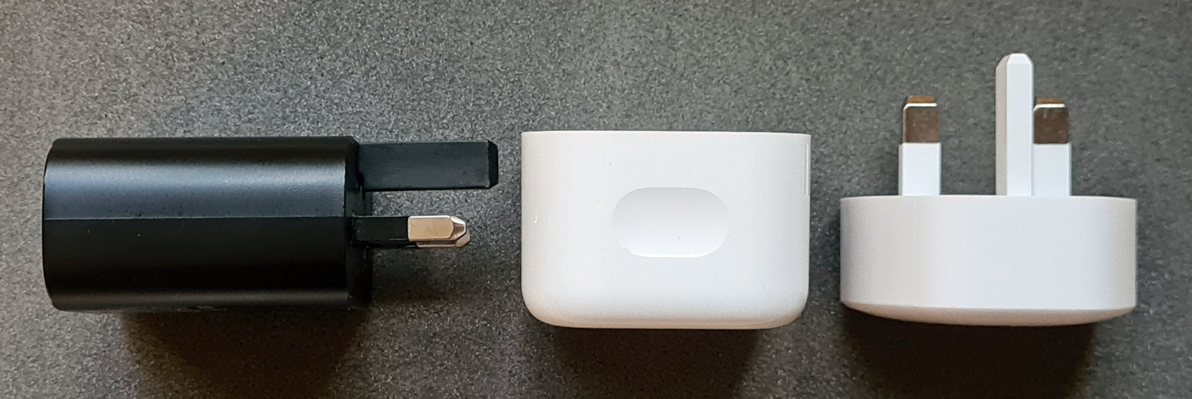 I went looking for a slightly smaller and more compact option that still had a USB-C cable connector port. At 85g the Apple USB-C 20W Power Adapter, model A2344 is heavier than the Samsung product. The three pins on the Apple adapter fold away entirely into the bulky body which makes this item a smaller and less awkward object when stored. When folded this measures 46mm x 49mm x 30mm. Manufacturer specifications are: