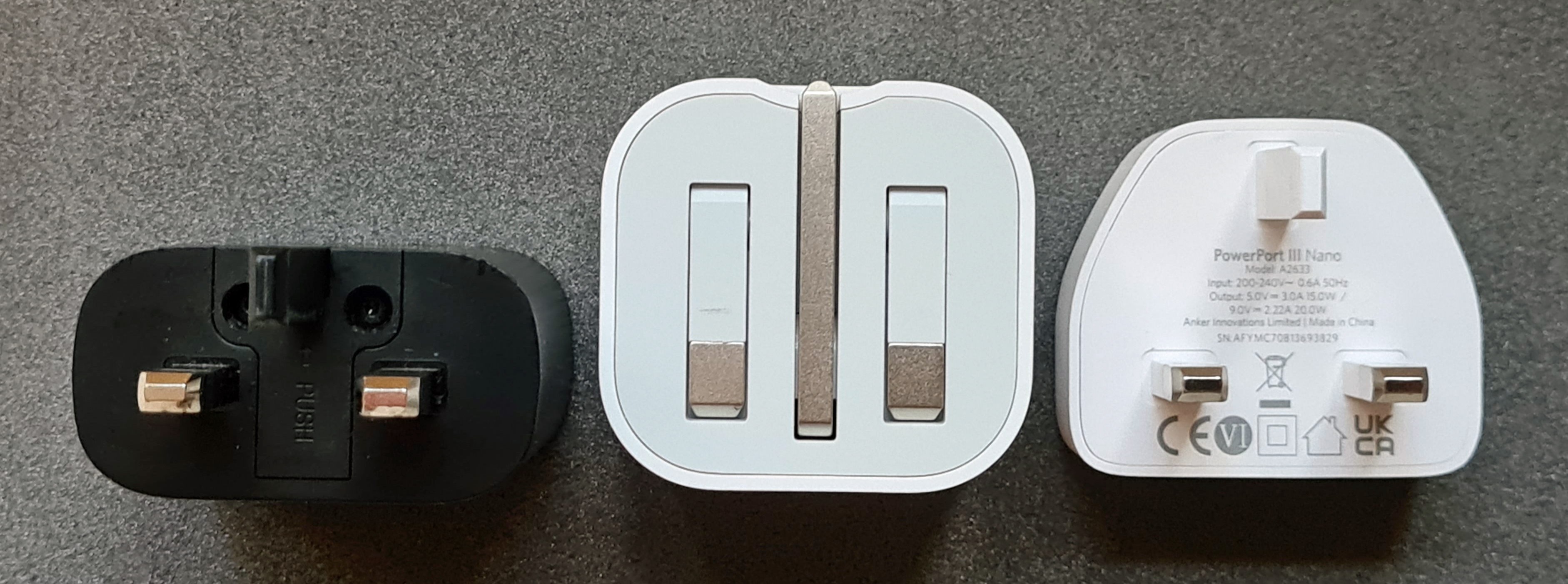 For many years Three Points of the Compass has used various folding power adapters and plugs for charging phone and power bank at halts. However with recent changes in port type and Power Delivery combined with large capacity phones and power banks that support quick charging, alternative solutions have had to be found. The search continues, but a glance here at three adapters.