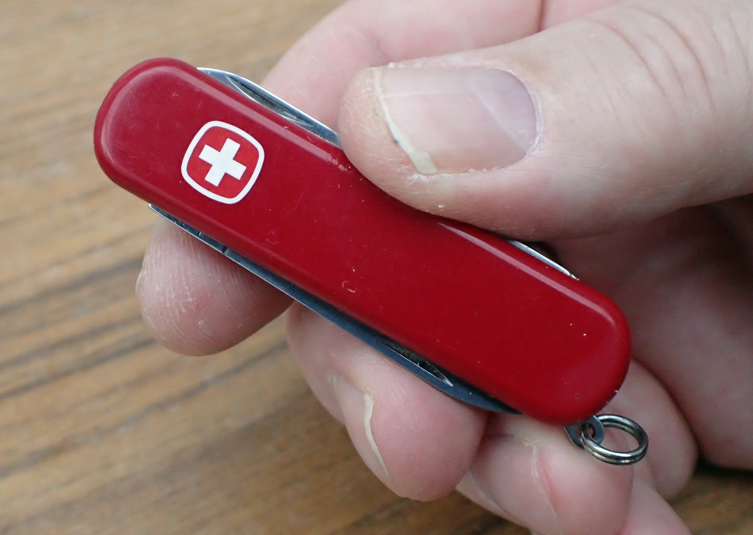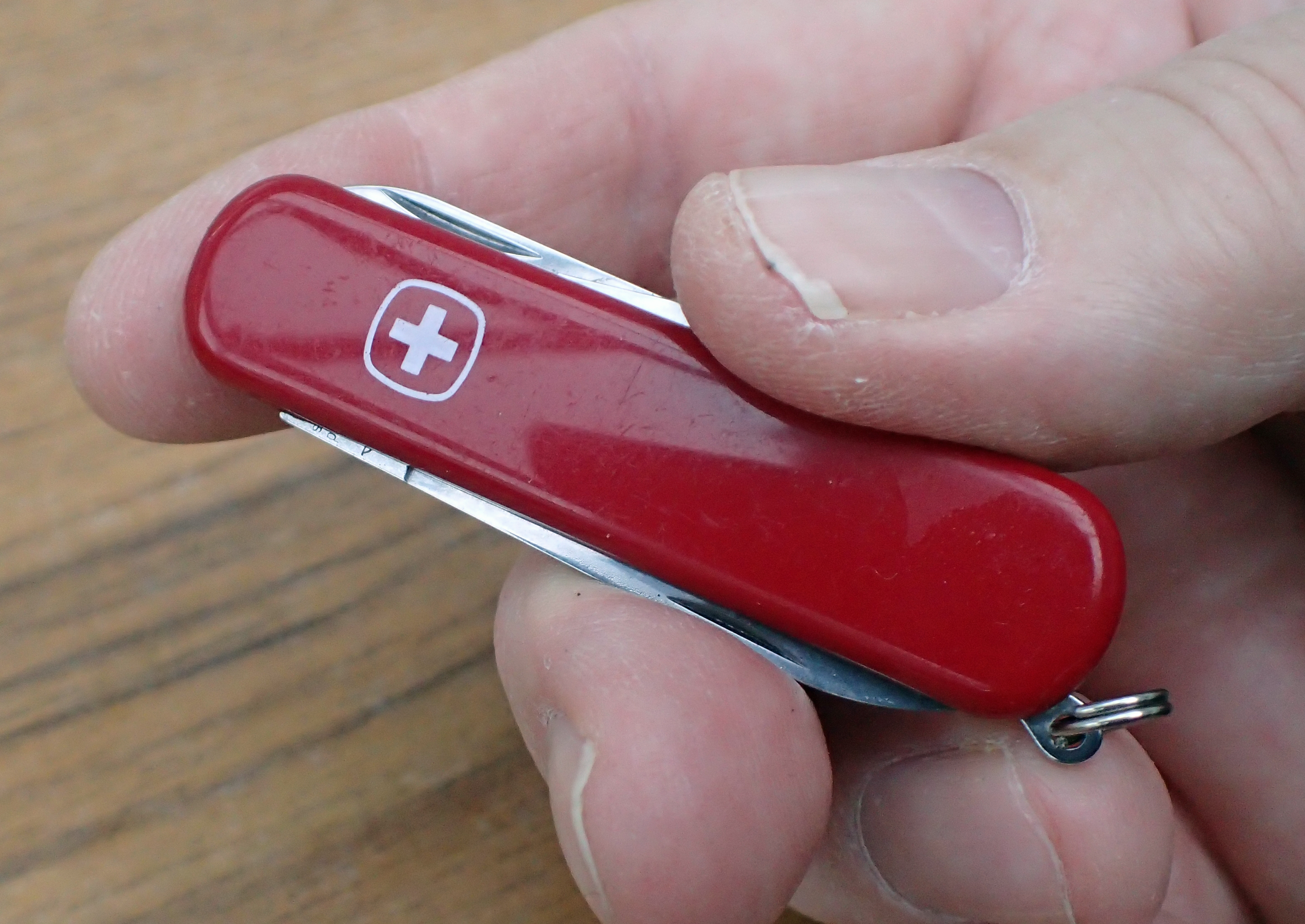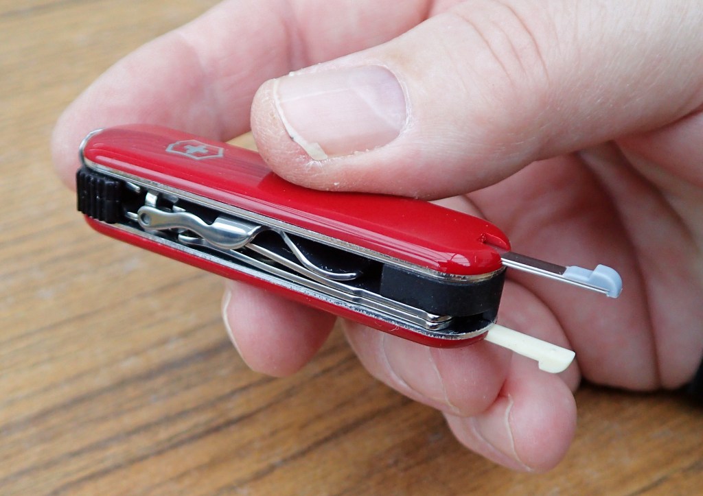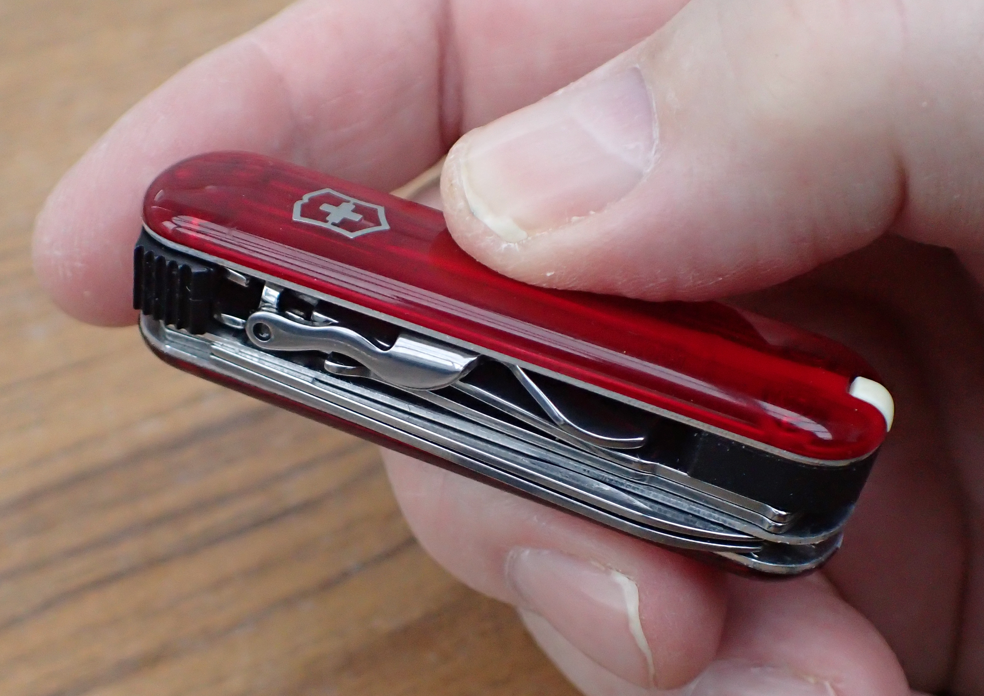 With the 2014 change in branding from Wenger to Victorinox Delémont, the former Wenger scale tools, accessible from slots beneath the lip of the scales, changed to the larger Victorinox type of scale tool, the toothpick and tweezers sitting into a cut-out in the end of the scales. Three Points of the Compass is not the greatest of fans of the tweezers and toothpick found on many Swiss Army Knifes. The tweezers are a little too flexible for decent gripping of obdurate thorns and splinters, though if you grip nearest the tips, it will extract very small thorns. The tips could do with a far sharper angle to them for tick extraction duty and a dedicated tick tweezer is best carried for that essential task. The toothpick is a nasty little addition. It simply harbours bacteria in its slot, there to be transferred to the mouth. I refuse to use them for their intended purpose though they can also be used to hook out trail gunk and pocket fluff from between the scales.
