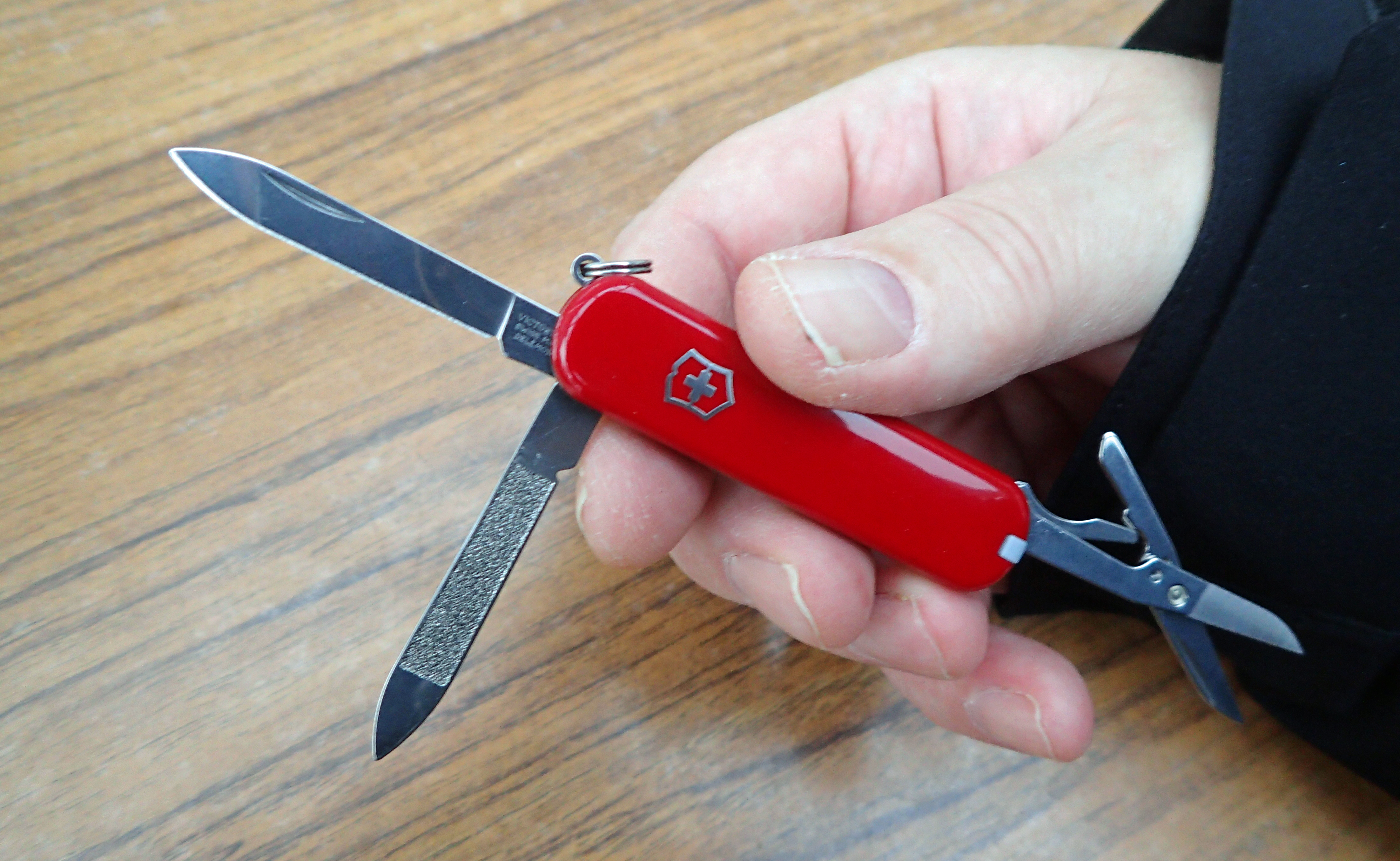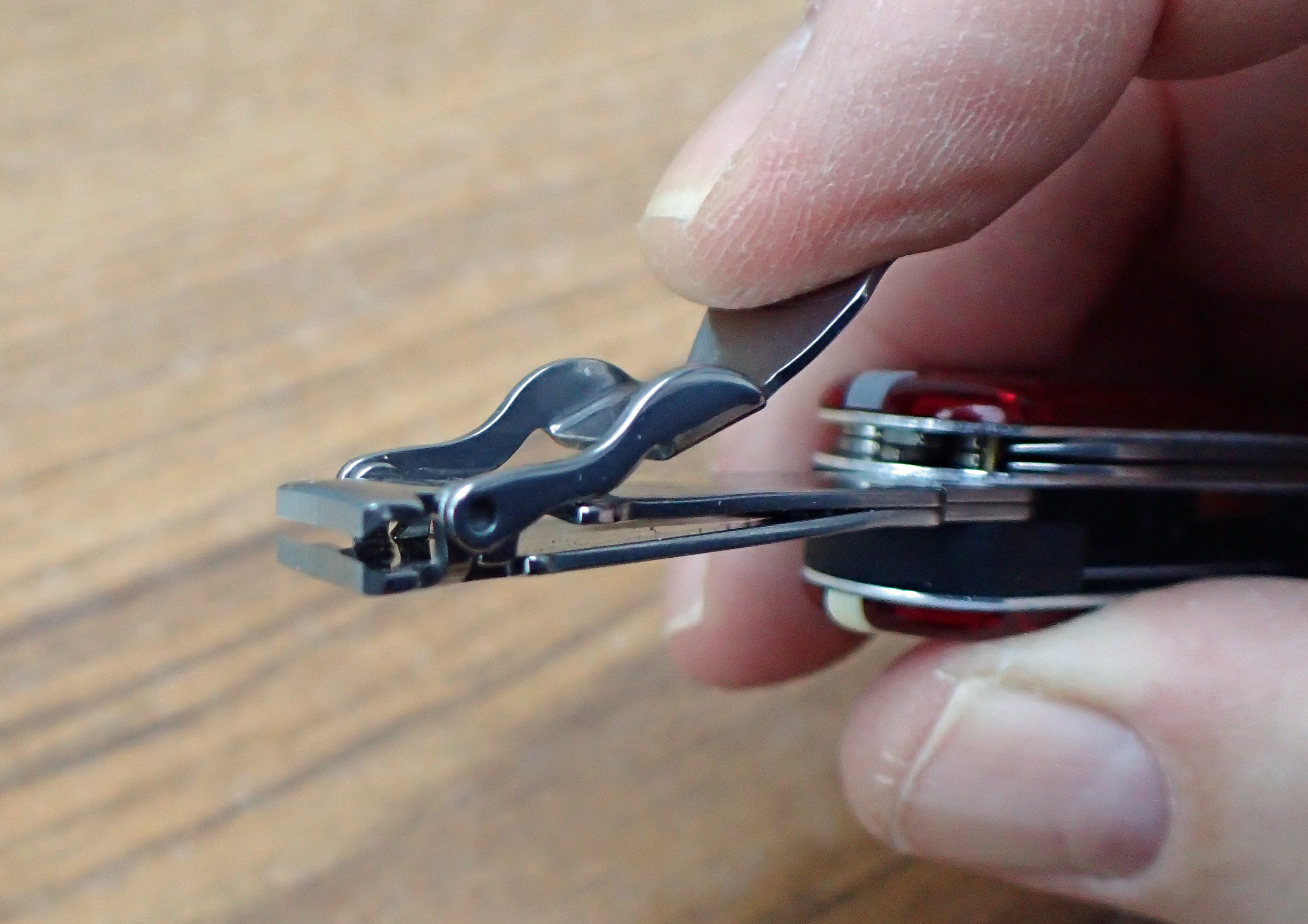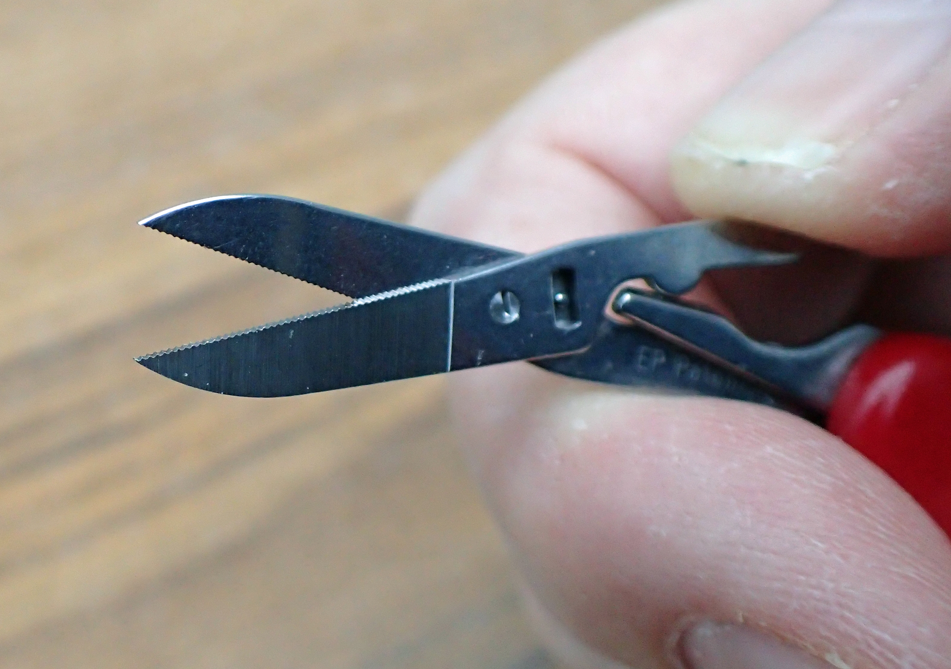 The 45mm long scissors on these knives have the exact same 16mm long cutting edges as those found on the smaller Victorinox Classic. But all of this is practical usable length on the 65mm knives. The cutting edges on the Wenger scissors are different too. The scissors have ‘self-sharpening’ edges and micro-serrations. They also have a lever type back spring, unlike the Victorinox which usually incorporate a small spring. The back spring is more reliable in the long term with less reported breakages though the small spring on Victorinox type scissors can be purchased as an after-sale replacement if necessary. Some users don’t like the serrations on the Wenger scissors but Three Points of the Compass finds these particularly useful on such tiny scissors as they provide a little grip on slippery materials. I have found these small scissors ideal for many small and simple ‘on-trail’ tasks. While the scissors will trim nails and I have used them for that, they are not particularly suited to this task as they leave a slightly roughened cut edge that then requires smoothing. Dedicated nail clippers are preferable and a potential solution is included below. There was a very subtle change in scissor design in the earlier years that prevented pocket fluff etc. jamming up the pivot action as much as very earlier versions of the Esquire did. Though it still pays to keep the scissors on all versions from all years as clean as possible.