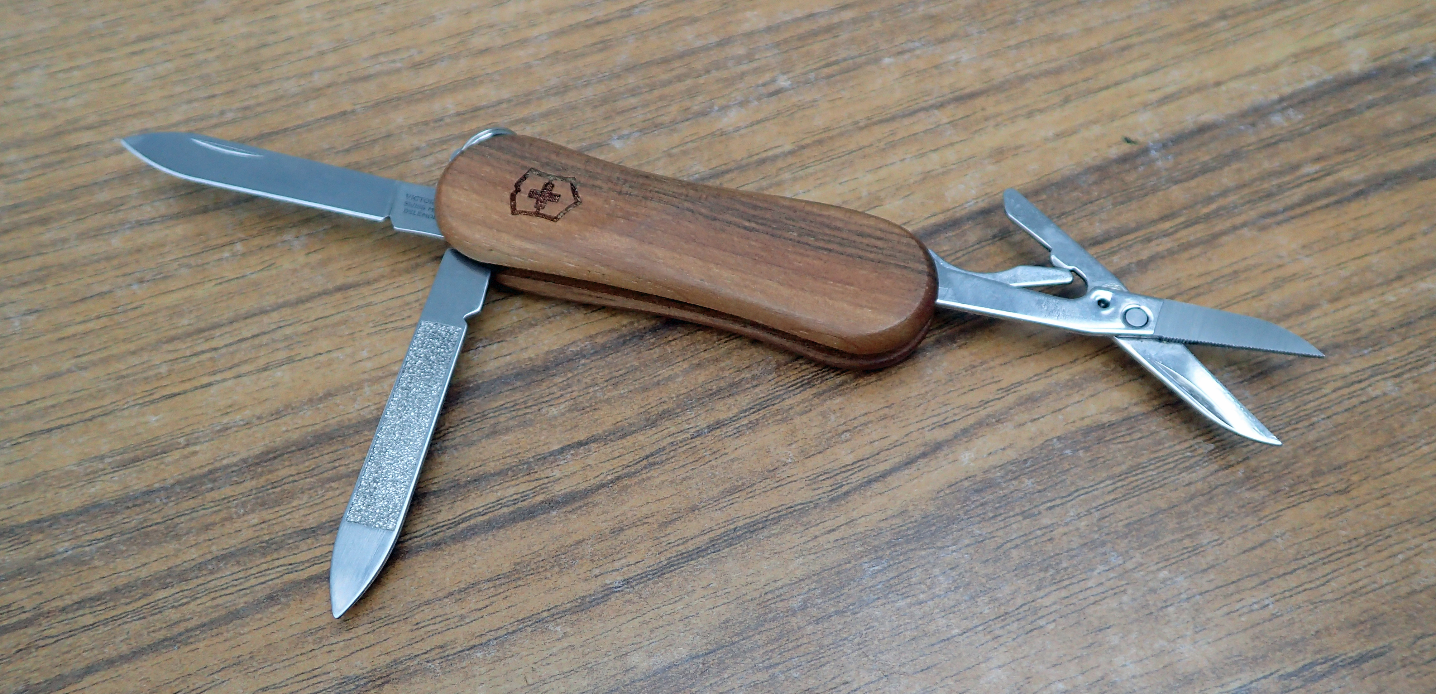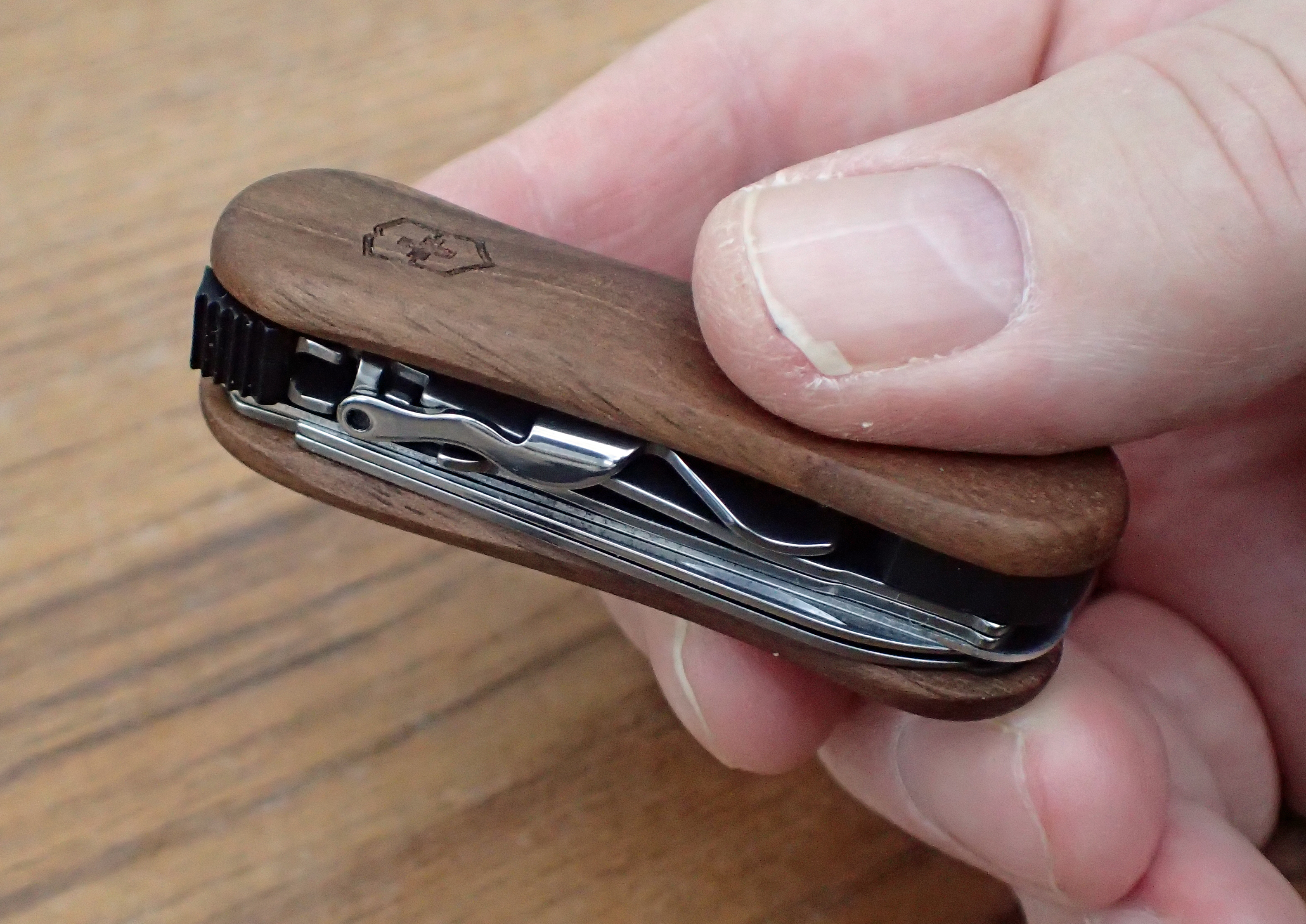 The 20.2g Victorinox EvoWood 81, model 0.6421.63 version of the Executive 81 has sculpted european walnut ‘Evolution’ scales. While these are very attractive they are not particularly ergonomic and they don’t do much to improve grip. Three Points of the Compass took a closer look at this handsome wood-scaled knife here.
