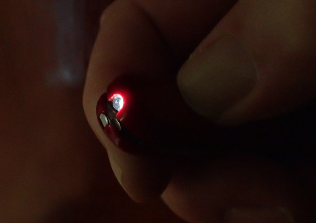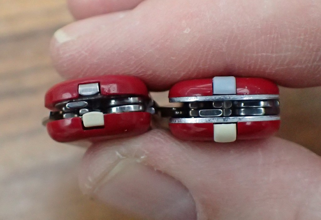 There is a small sliding tray in the side of one scale that holds two 3v CR1216 batteries. These batteries are prone to slipping out and being lost underfoot when being changed. This is a brighter LED light than the Victorinox SwissLite alternative, looked at here, but still of modest lumen when compared to some of the tiny keychain LEDs generally available now.