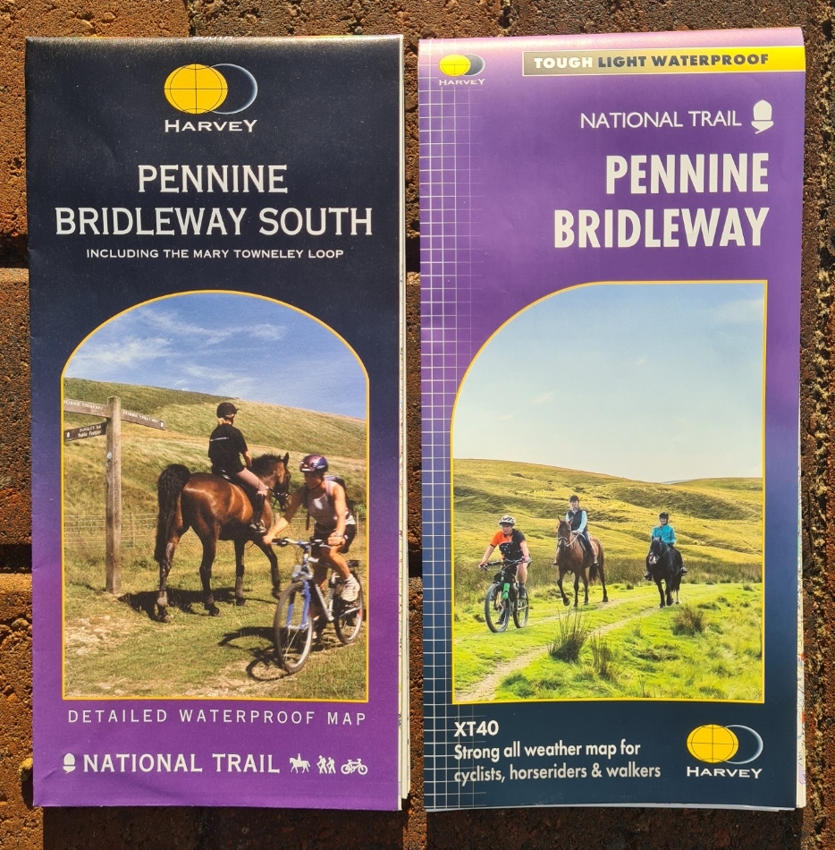 First and second generation Harvey maps for the Pennine Bridleway. Unlike the first, the more recent map covers the while trail, at 1:40 000 scale. It takes a ‘best guess’ at what will be the final defined route. 2004 and 2021