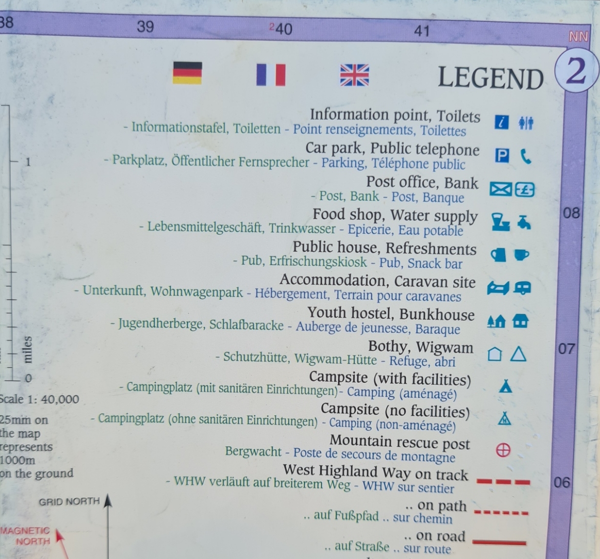 Unlike Ordnance Survey maps, which include only English. Harvey map legends for the longer trails are printed in English, German and French. This makes them slightly more user friendly for overseas visitors, particularly on the internationally popular West Highland Way (detail shown here)