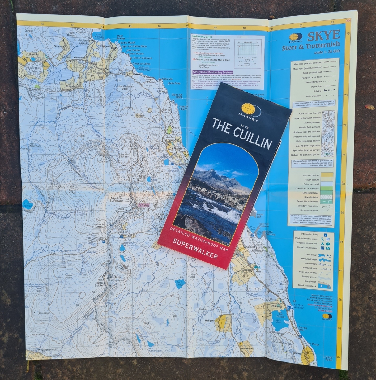 Part open Harvey Superwalker map (showing the Quiraing) for Storr & Trotternish, 2009, with front cover of Harvey Superwalker for The Cuillin, 2011. Both maps at 1:25 000 scale