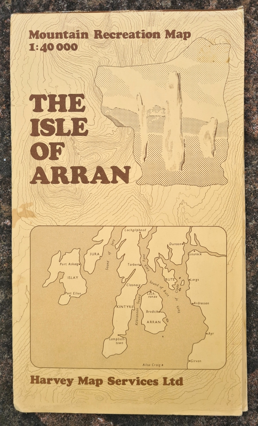 Early Mountain Recreation Map from Harvey Map Services. Isle of Arran at 1:40 000 scale. This is a non-waterproof map but was also available in a waterproof edition. Other waterproof maps available at the time were for Borrowdale, Dartmoor, Helvellyn, Howgill Fells, Peak District, The Rhinogs, Scafell and Strathyre. This 1984 revised edition relied on photogrammetric and field surveys based on air photographs completed in 1972