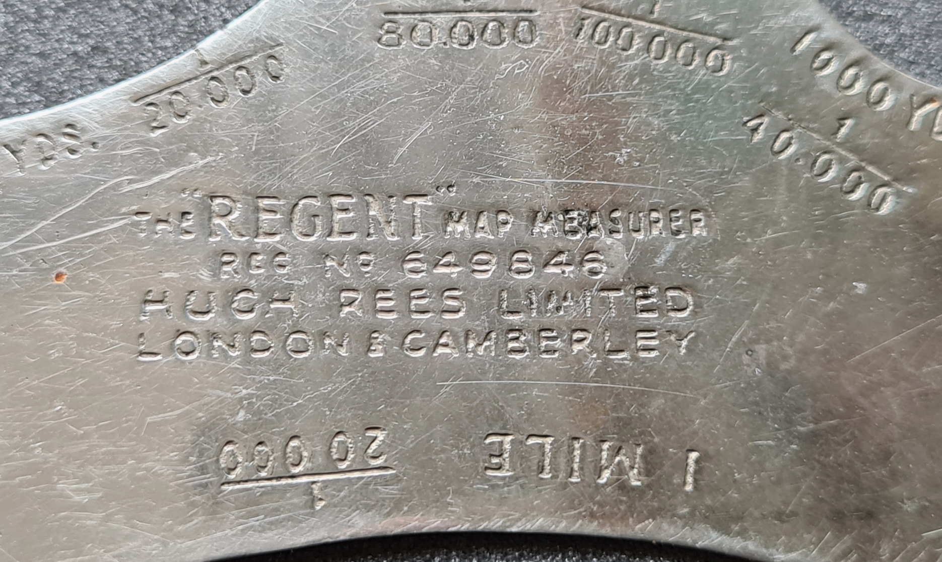 Hugh Rees Ltd. were booksellers, publishers and stationers, first established in London, who expanded their operations to Camberley, Surrey, some thirty miles from central London. In addition to reading material, Hugh Rees put their name to various small instruments such as compasses, dividers, wood rulers, protractors and this map measure. The business operated from 1905 and ceased trading in 1949, which suggests an extreme date range for this interesting little measure. Made of steel, this is quite a small tool. Dimensions are 51mm by 90mm, or 92mm across the extreme widest two points. The Regent measure is 0.75mm thick and weighs just 15g.