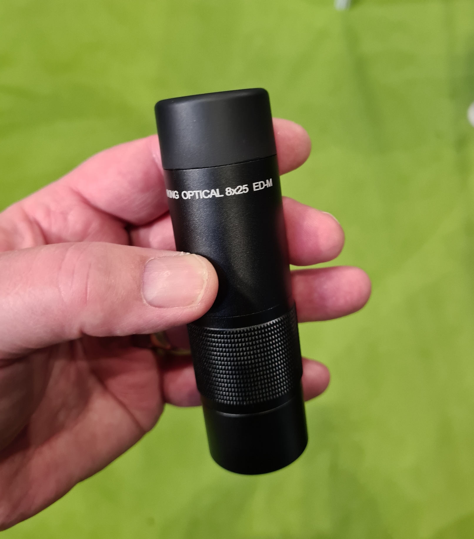 The Viking monocular has a lightweight magnesium alloy design with some rubber armour finish improving grip in the wet. They are Nitrogen filled to prevent fogging and waterproof. The focus ring can be easily manipulated and turned even when wearing gloves and at just 111mm in length this monocular will tuck away in the hip belt of a pack though the case can probably be swapped out for a simple ziplock bag. In 2022 this monocular normally cost £125 but with a little searching it can be found at under a £100. A case and strap is supplied with each monocular, along with a five year guarantee. It is a lovely instrument, ideally specced and suited to those prepared to pay a little money for that first venture in to on-trail optics.