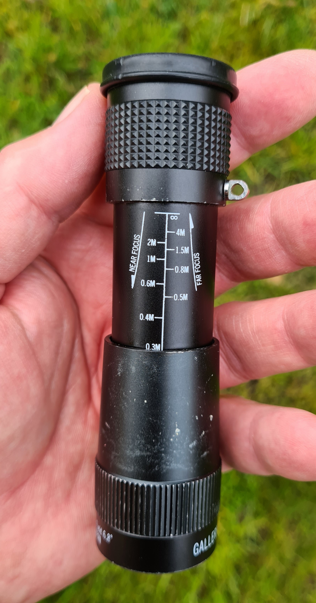 Few accessories came with my little monocular when I purchased it almost a quarter of a century ago. There was a cleaning cloth (lost to the mists of time), a hand strap (likewise lost) and a small brown leatherette zip case. I never liked this due to the snagging zip and the lack of waterproofness so always carry it in either a small DCF drawstring baggie or a zip lock sandwich bag, or both. Unprotected as it is, it is not surprising that the body has sustained a multitude of scratches over time, but internal optics are still in place. The latest model Gallery Scope comes with soft case with handstrap and dust caps. The dust caps do not permanently fix on and are easily lost or mislaid, as were mine decades ago. For a handstrap I have on occasion added a short length of cordage to the hanger on the side of the ‘scope, but more often than not, do not bother with anything.