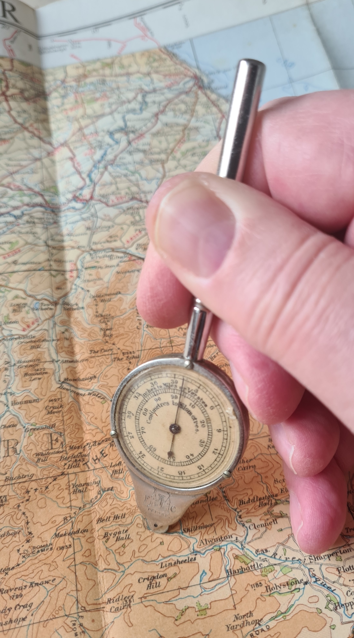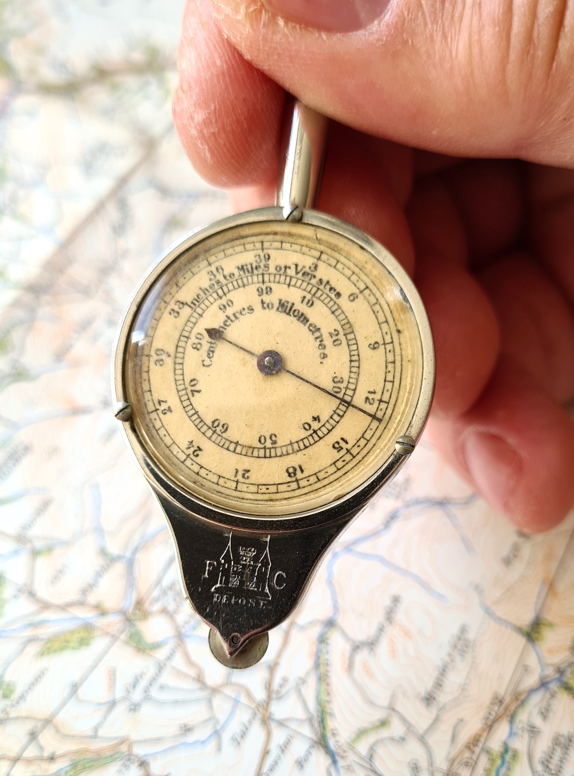 This FC measure is quite well made. The case is robust and the crystal is pinned with three fine screws so could be replaced if damaged. The crystal on this measure has been knocked and a tiny chip is missing around the ‘two o’clock’ edge. That said, the paper dial is not centred and appears to have rotated slightly. Unsurprisingly, the dial has also yellowed with age. The scales on this measure are largely obsolete with maps today. However if the measure was used to track any route, line or path on a map and rotated back against the scale usually present at the bottom of a map, this instrument would still perform the task for which it was created. This despite any recording inaccuracy that has crept in with the scales shown on the face of the measure.