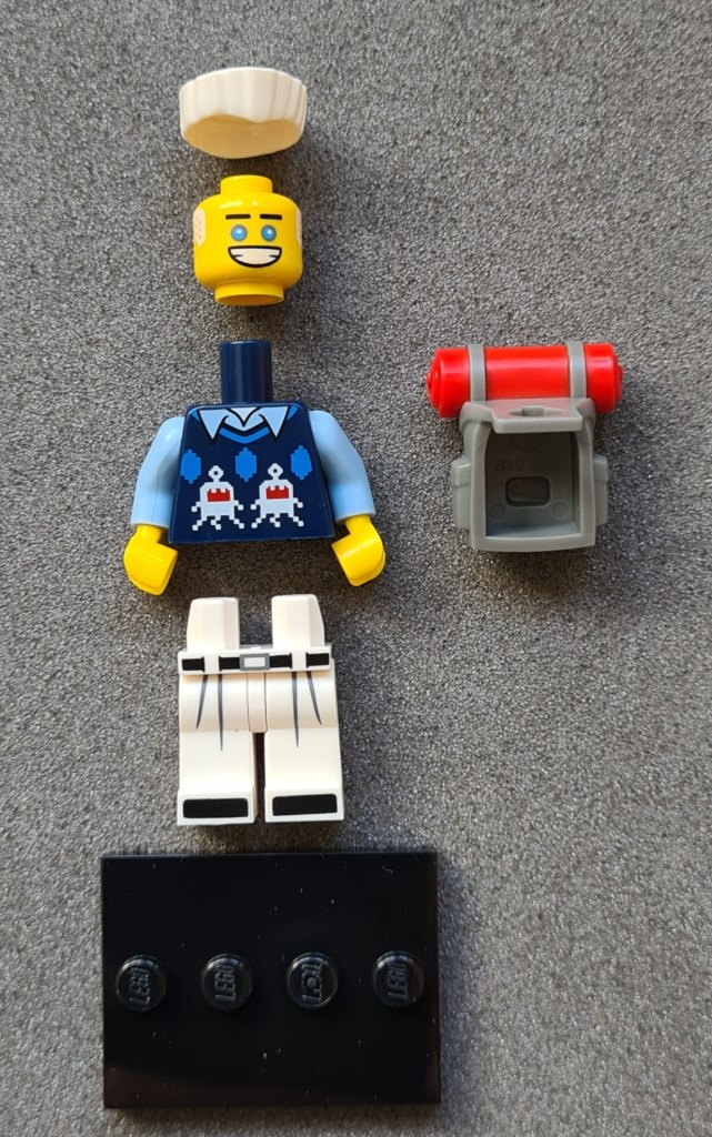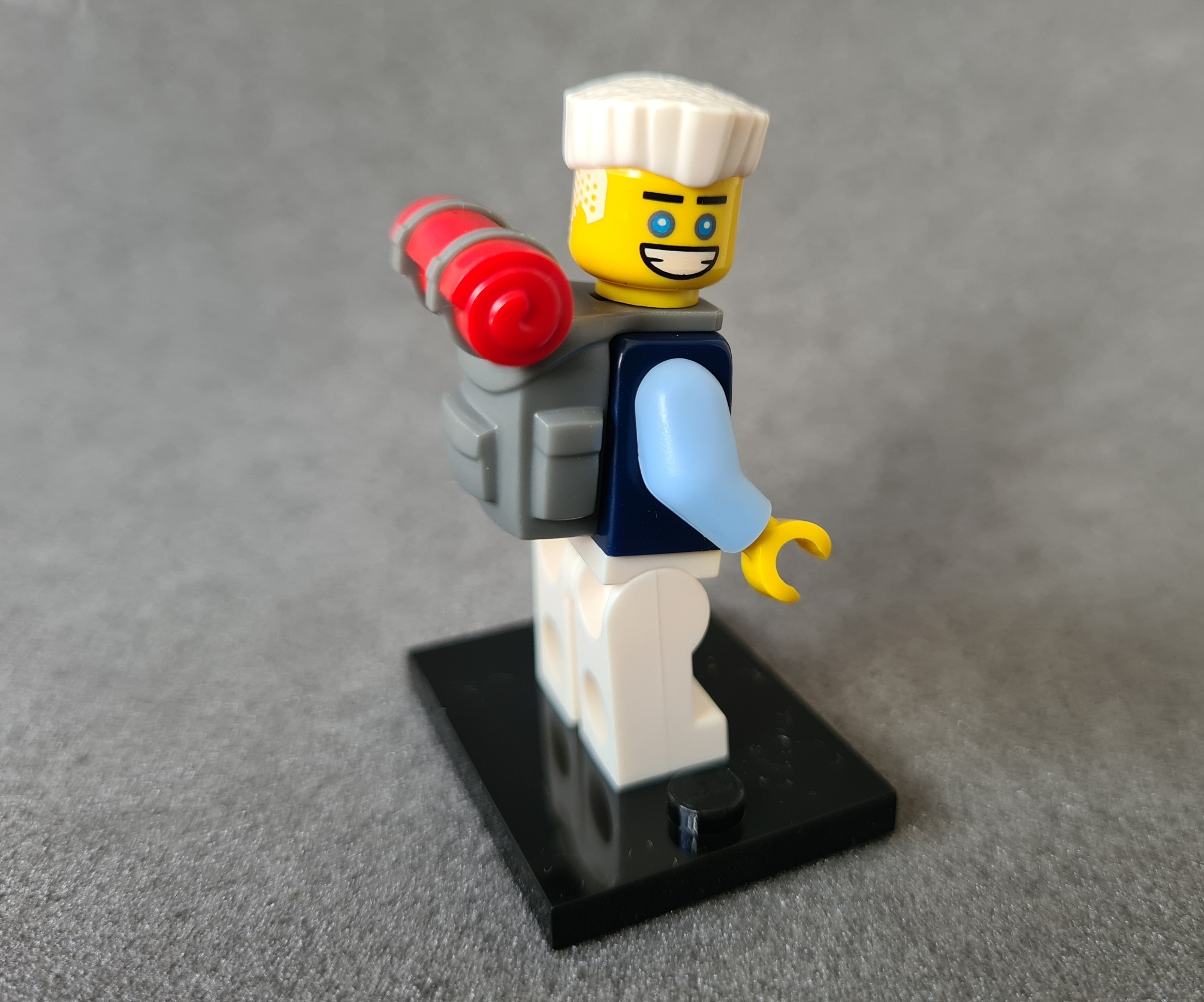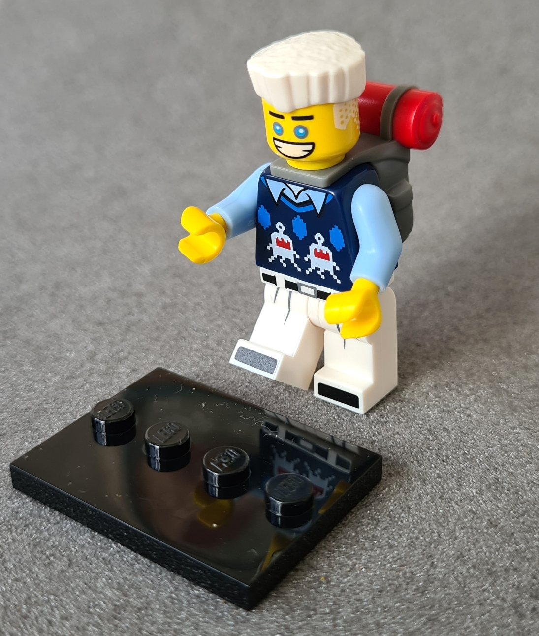 Our Zane hiker may be more familiar to Lego aficionados as a ‘nindroid’ in ninja garb as seen in a lot of other Lego Zane minifigures that first appeared in 2011 and in the Lego Ninjago Movie and associated adventures, however his 2017 minifigure high-school figure looked at here is in casual backpacking mode. There is little to this minifigure but his character certainly shines. Above a knitted top with vintage computer game pattern, it is the face that mostly sets him apart- buzz cut below a sharp looking white hairpiece (that first appeared on a Zane minifigure in 2014). Zane has bright blue eyes and appears glad to be out hiking with a broad open mouth smile. There is no alternative face on this minifigure unlike Lego Hiker 2018. His grey coloured backpack has a large red bedroll atop, unless it is supposed to represent a large rolled closed cell foam mattress. This pack was a new Lego part on this release. Other than that, Zane has belted white trousers with pleats and black toes to his footwear.