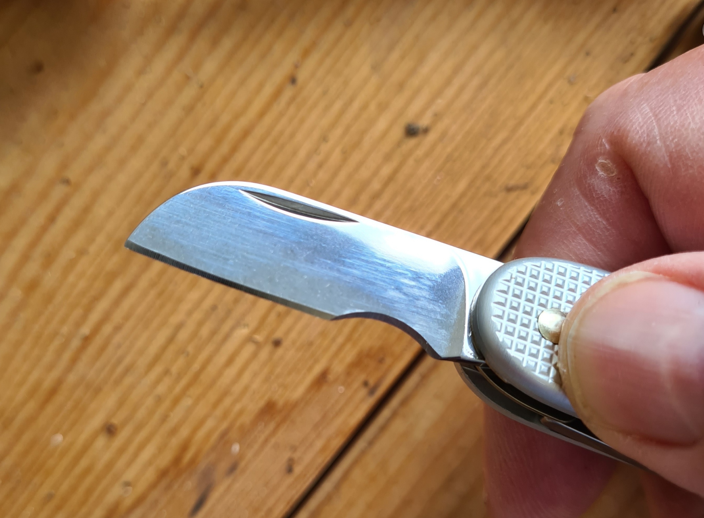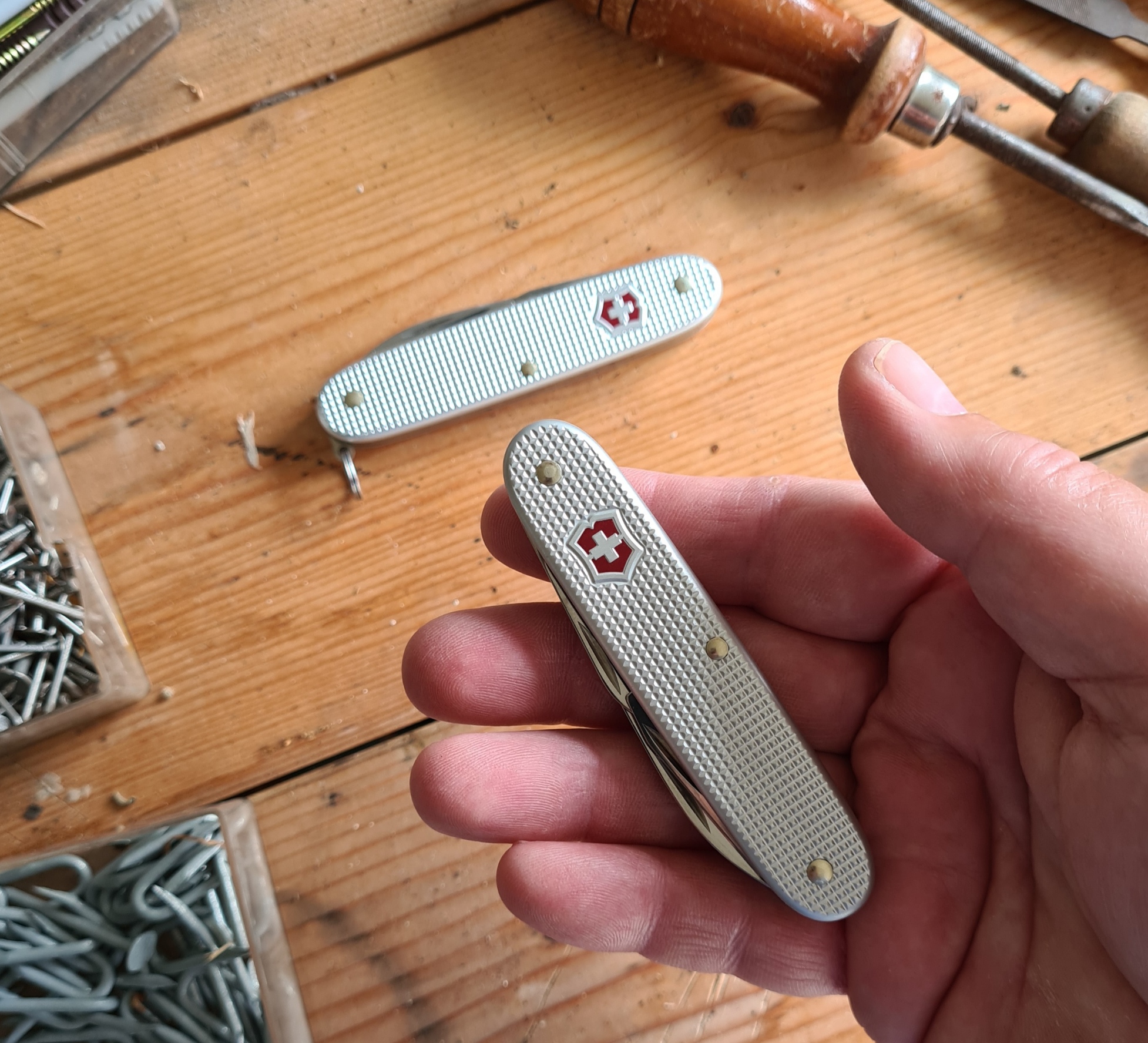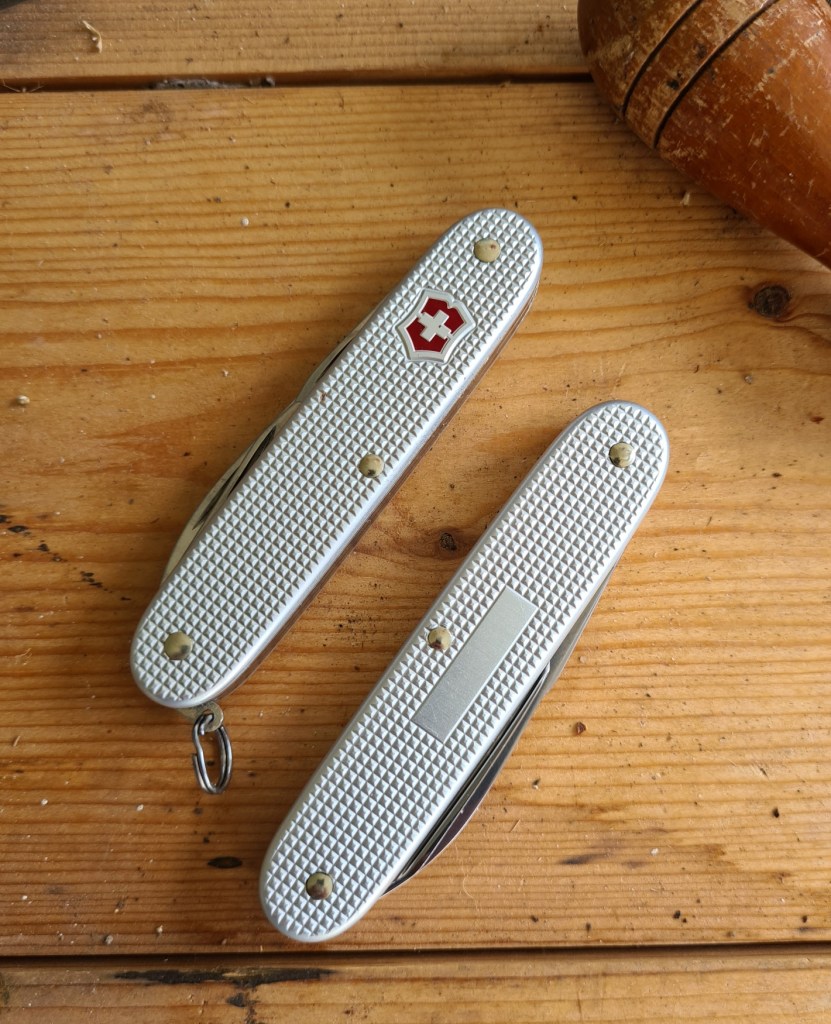 The scales on these knives are Aluminium Oxide, or ‘Alox’. These are tougher than the standard plastic cellidor scales found on the majority of Victorinox knives and more resistant to cracking or breakage. The anodised colour finish can wear and fade with use and pocket carry, developing a lovely patina over time. Some find this unsatisfactory and undesirable but I think it rather attractive. That said, I carried and used the Pioneer shown here for over a decade as a favoured EDC tool and it still looks almost new. Mostly because it was carried in a dedicated pocket inside a pack. The standard colour for these two knives is the silver alox, but other special edition colours have been released on occasion. Most of these Pioneer range knives share a common fault in that the anodised finish toward the edges can often be quite rough. Both of mine exhibit this and it isn’t satisfactory even if a standard problem of manufacture.