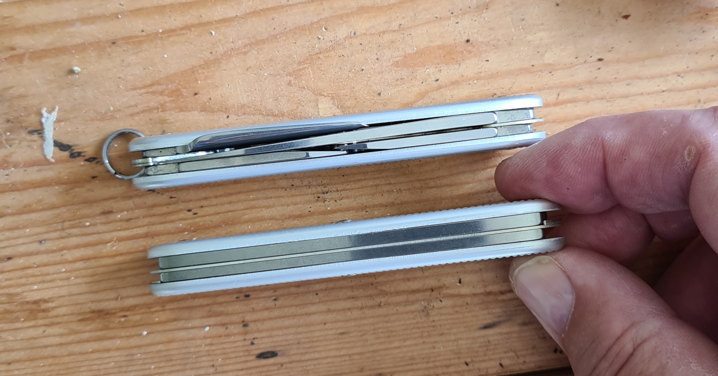 The awl is 37mm long with a 27mm long sharpened edge and has a sharp point so is perfect for punching a leather belt, or poking through cordura or shoe fabric for emergency repair, however there is no sewing eye on either awl. This is a really effective reamer to drill or widen a hole in wood. A ferrocerium rod can also be struck against it. The pioneer has a keyring attached beside the awl but a bunch of accompanying keys will hinder use, but this knife is too large to hang with keys anyway. All the tools on these two knives have nail nicks, other than the awl, which has a lip under which it is easy to hook a thumbnail, making this the easiest of the four quite stiff tools to open.