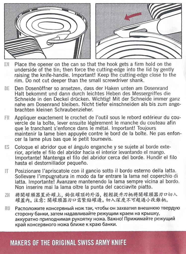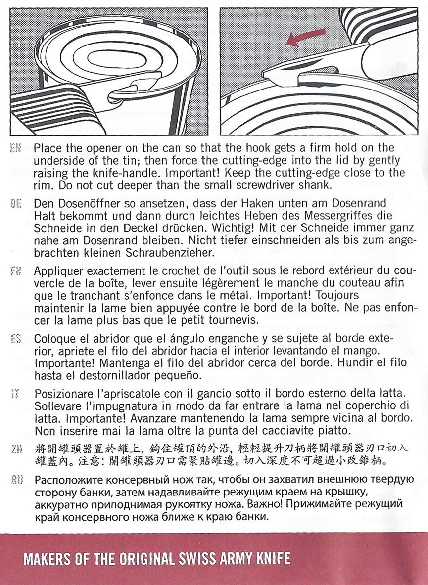 The Pioneer has a can/tin opener at the opposite end of the tool. I have never found any difficulty in opening dozens of tins with this and it still looks like new. There is also a small 3mm flat tip screwdriver on this tool that is sadly too large for use with my glasses but I have used this with some Phillips head screws.