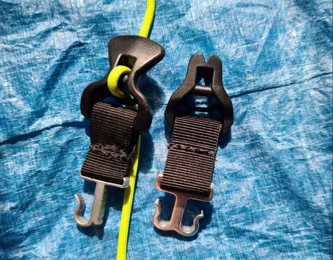 I emailed Zpacks on my return and within a couple of days had a reply asking for my UK address for this US company to post me a pair of gratis replacement hooks. Excellent service and also what I would expect from them. The metal hook design has been tweaked very slightly with thicker metal however the Lineloc 3’s have changed to Lineloc V’s that have a more defined v-notch to stop the (up to 2mm) cord slipping. Not that this has ever been an issue for me. I am interested to see how the change in Lineloc transmits to use in windier conditions. To give the whole its correct Zpacks moniker, it is a Double-Hook Apparatus Lineloc V, for 1-2 mm cord. I notice that Outdoor Gear Essentials also sells these as an upgrade to those used on the Lanshan.