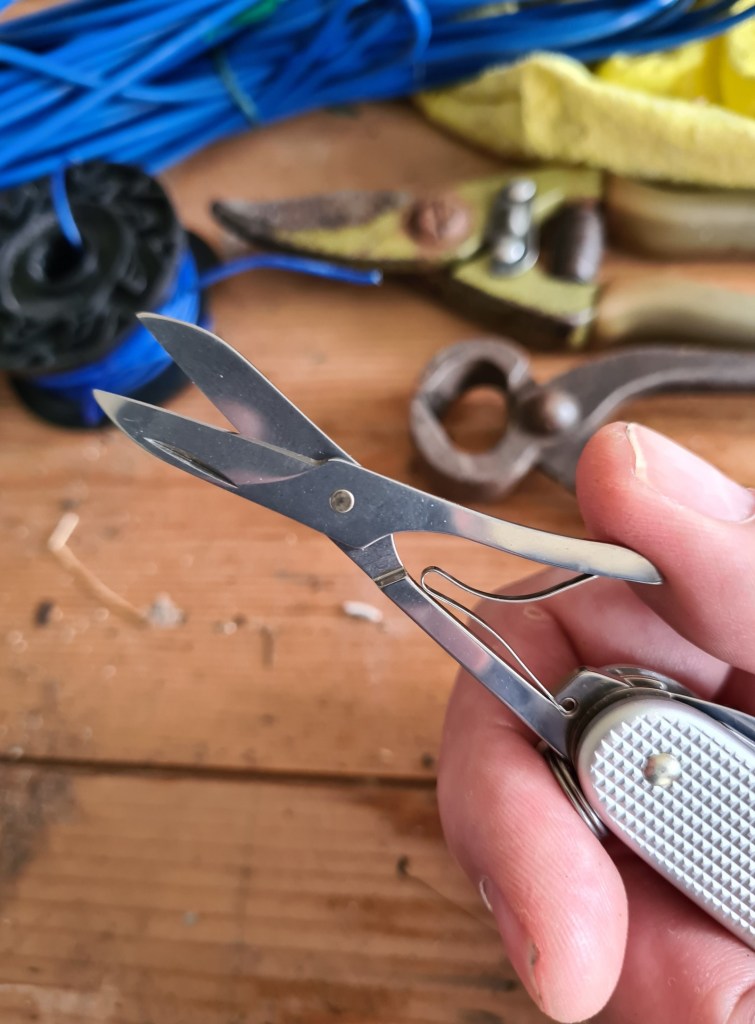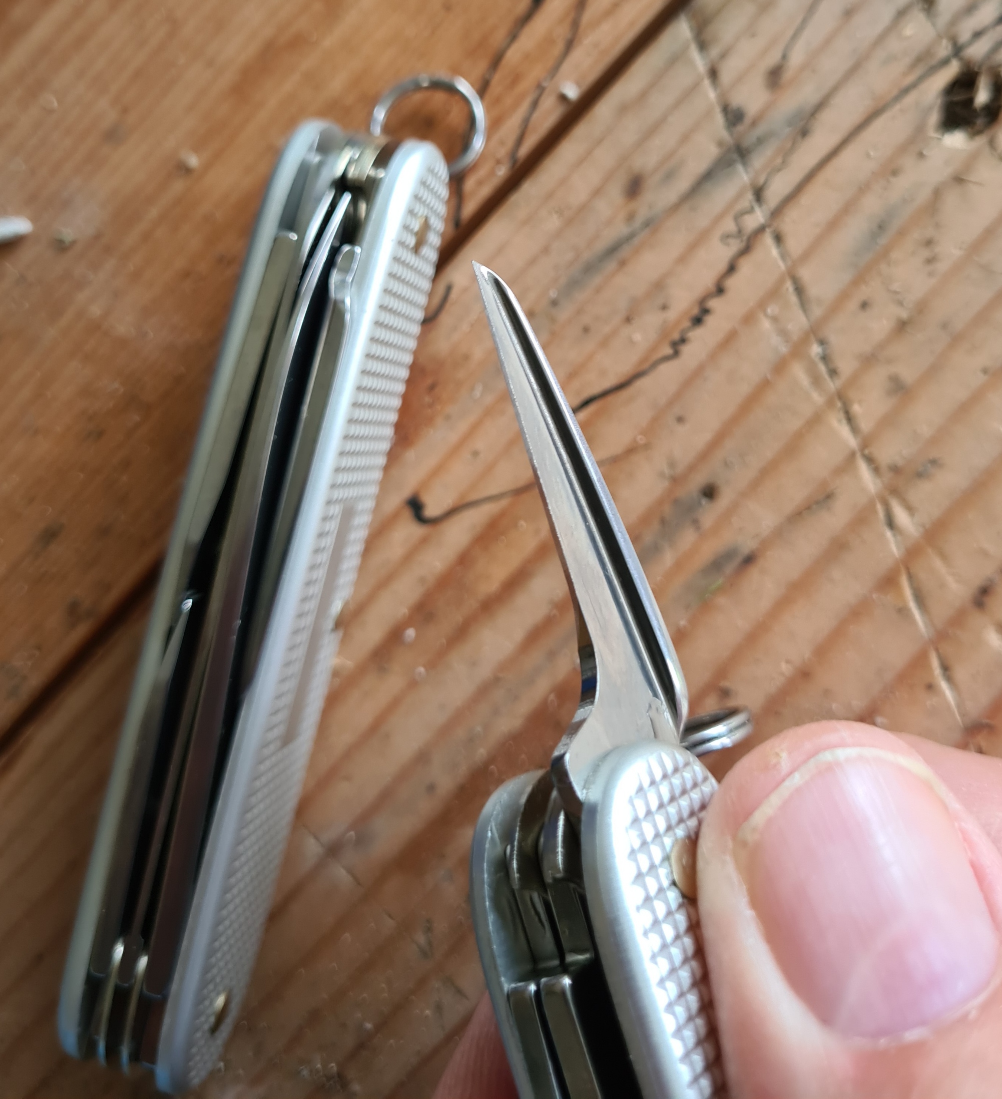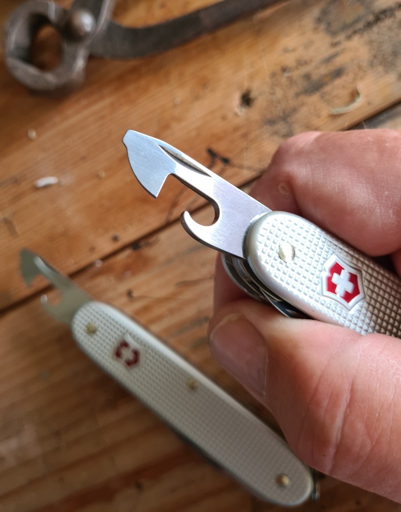The scissors are the X in the name of the Pioneer X, just as they are in the four-layer Farmer X which I shall look at in another post. While the three-layer Farmer has a long history, dating back to the 1950s, the Pioneer X first appeared on the market in 2016 and was welcomed by fans who missed the capability of a larger pair of scissors. This was a major loss bought about because a factory tool used for making the scissors included on some 84mm Victorinox knives was not repaired or replaced when it broke resulting in that 84mm scissors becoming an obsolete and much missed feature. The Pioneer X was the first 93mm Alox knife to have a pair of scissors though they were already included on some 91mm knives. Scissors on 91mm and 93mm knives are identical other than the location of their nail nick.