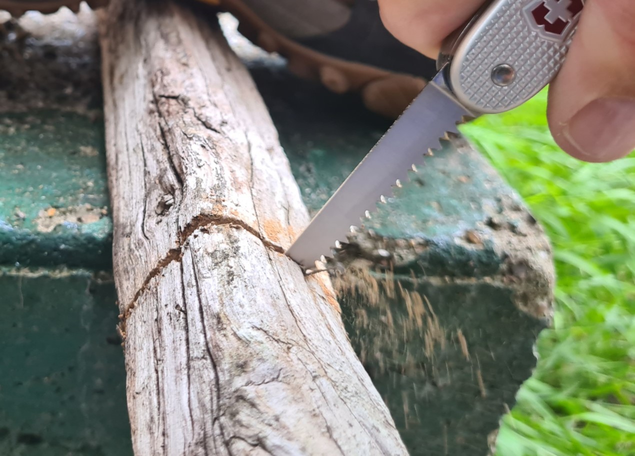 The saw on the three-layer Victorinox Farmer and its big brother, the four-layer Farmer X, saws on both push and the pull strokes. I have included an image of me sawing a one and a half inch piece of chestnut. This is about the maximum comfortable diameter that is reasonably within the capabilities of this two and seven-eighths inch (74mm) long blade, though you could push it a little and I have heard of some people successfully working round five inch diameter logs with this saw.