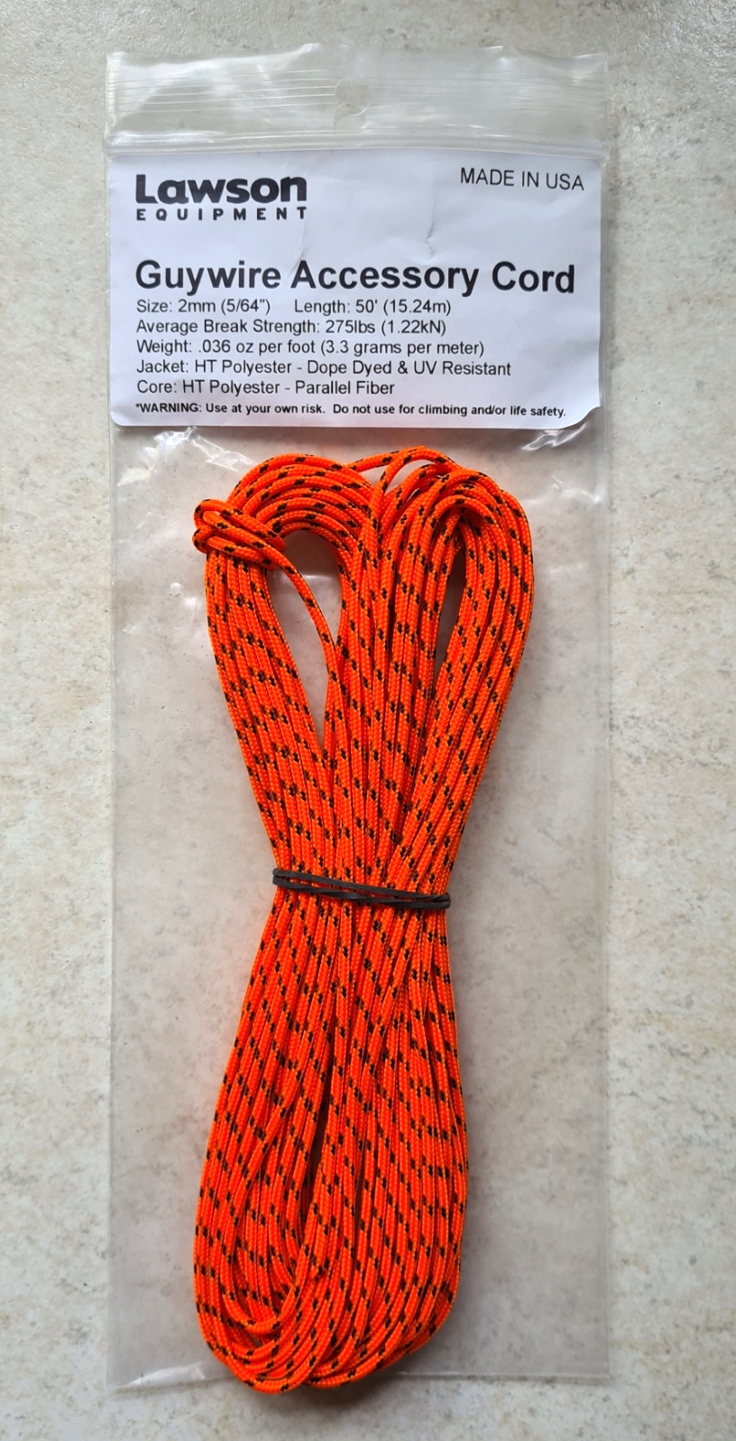 For my replacement loops on each peg and to keep the caps in place I used 2mm polyester Guywire Accessory Cord from US supplier Lawson Equipment. This is available in the UK and I purchased mine from Valley and Peak. This is a particularly strong low stretch product. I could have used the reflective Lawson Glowire instead but because I wildcamp I try and steer clear of reflective materials for discreetness, though I may be going over the top for just a couple of inches of cordage flat to the ground. However the Guywire is also (obviously) used for replacing or adding guys.