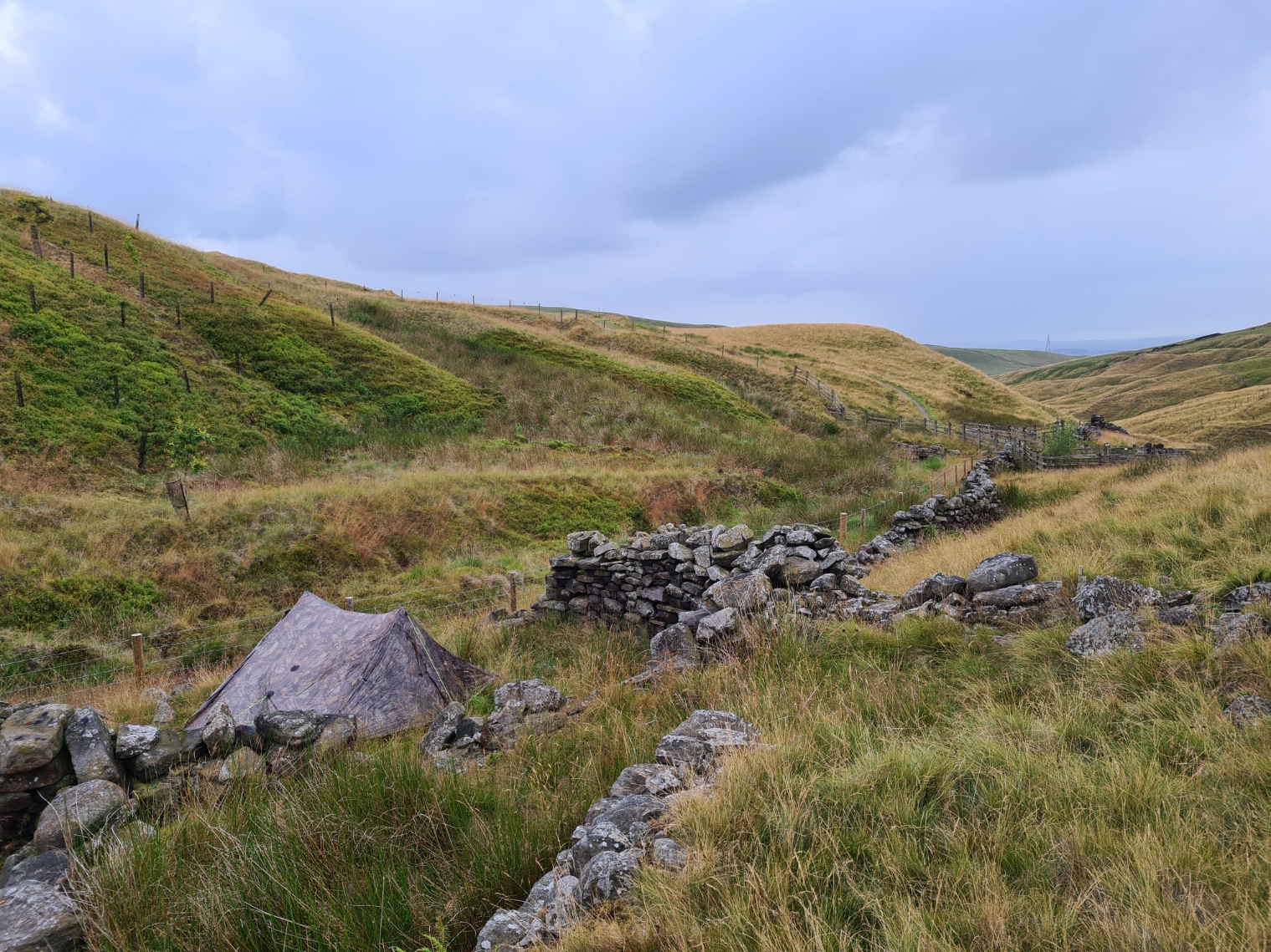 Once back on the main Pennine Bridleway, the Mary Towneley Loop behind me, I was as usual unsure where I was going to stop for the night. Little leapt out at me on the map and I soon came across grazing Belted Galloways. I am always a bit wary of camping near bovines as, even lacking malice, they can trample a shelter through sheer curiosity. Dropping down to cross a gully and one of the little tributaries of Swinden Water I could see the ruins of some long abandoned folds or buildings. Despite being lumpy inside the tumbled walls there was no sign of cows having wandered in so was able to orientate the Duplex sufficiently well that there was a Three Points of the Compass shaped flattish spot diagonally below the footprint. The Duplex is a forgiving shelter and this was by no means the first time that I had managed to pitch it in an apparently unsuitable spot.