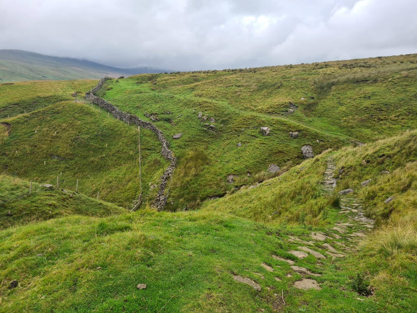 Leaving the road, I passed Hazelgill Farm and the track began to get steeper, passing under the railway that also followed the side of the valley and continued up toward Wild Boar Fell. It is a fairly long climb. Just about the final one of any note on the Pennine Bridleway and I took my time. It can get wild up here if the weather changes but the rain from the previous days had cleared off, the cloud base was a couple of hundred feet higher and I enjoyed the climb to ‘the wall’ on the saddle from where the path becomes better appointed and it is an easy, if long, walk down down down from High Dolphinsty to the sheep filled pastures on the lower slopes. There were a couple of final fords to pick my way across but my now dry feet remained dry. I passed Stennerskeugh Farm and felt that I was on the final stretch. This was a nonsense as I had a good few miles left to complete before my nights halt.