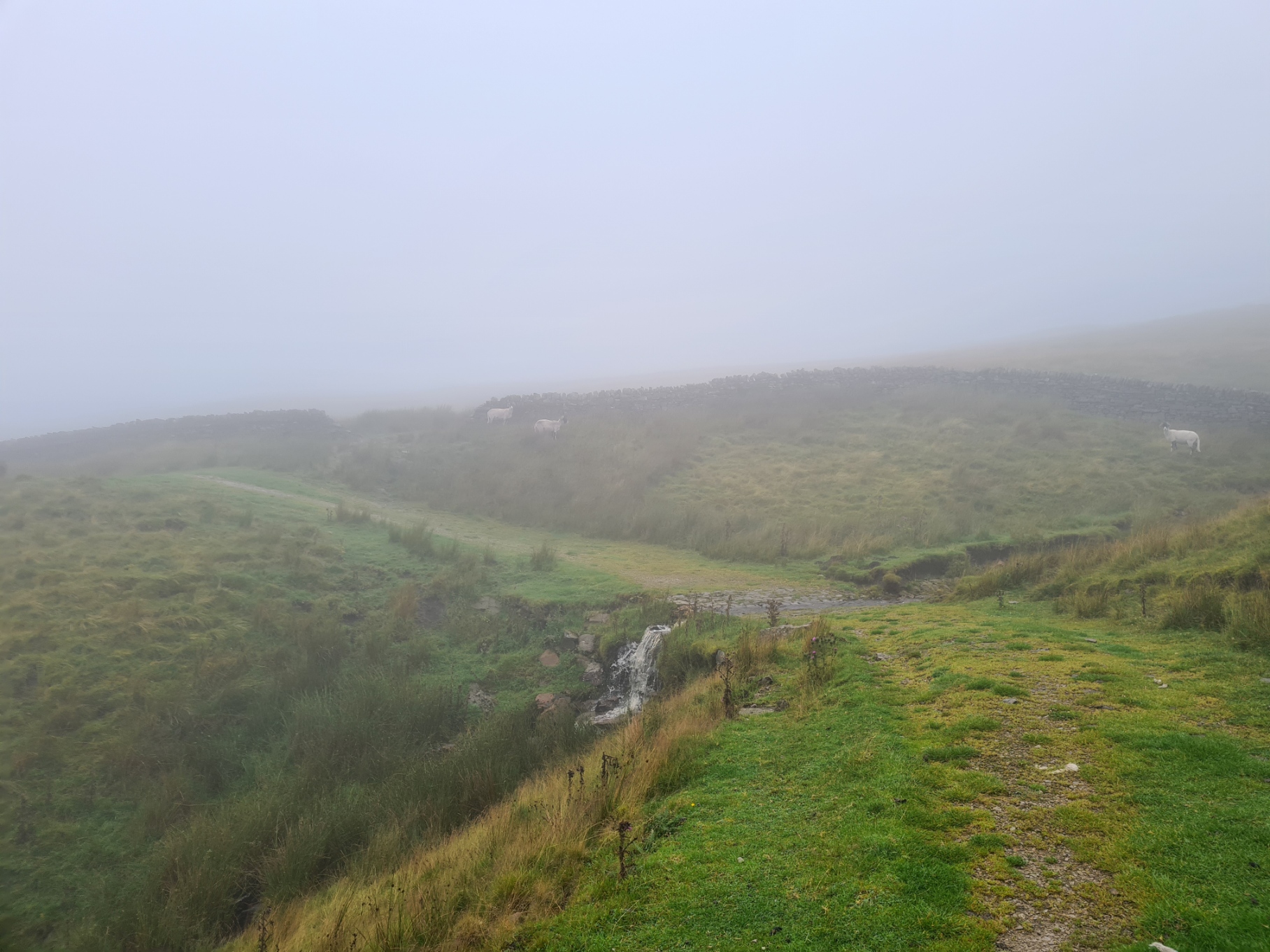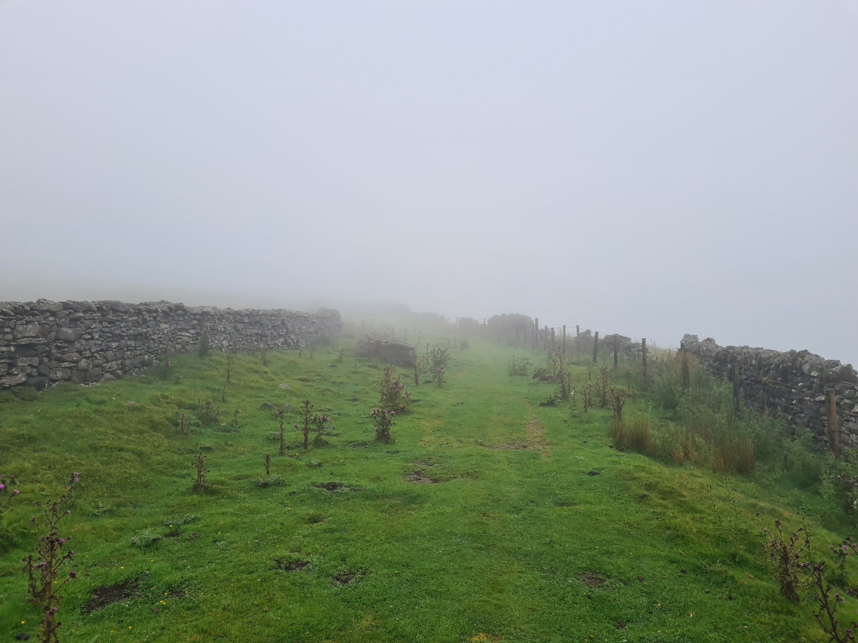 Despite the foul conditions overnight and night checks I slept well and, typically, the rain was mostly halted by the time I rose. By the time I was packed and began my walk across Ingleborough Nature Reserve it was just mist. I hoped it might brighten and clear but that wasn’t to be. The rain frequently returned during the day and despite some pretty awful weather with extremely limited visibility for a couple of hours I thought this was the some of the best walking of the entire 205 mile long trail and I had a fantastic day. I took few photos as the phone remained triple wrapped for protection against the weather for most of the day