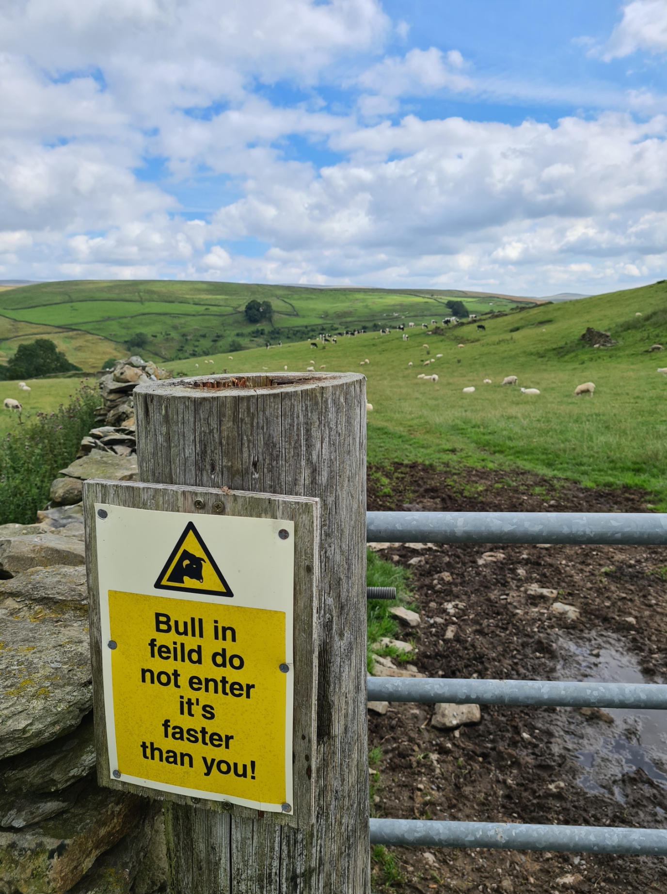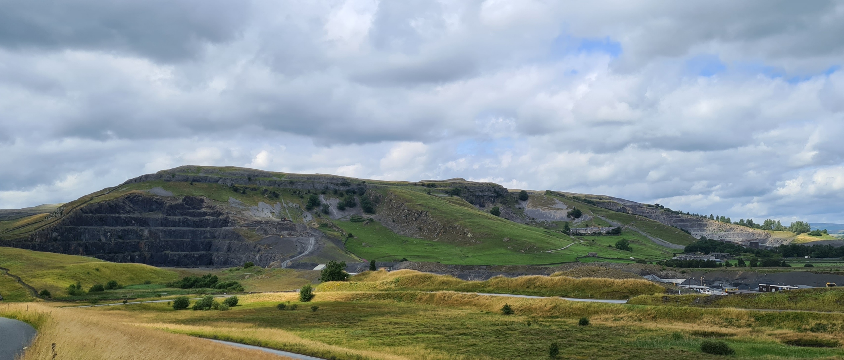 Climbing up the road out of town, muck spreading was underway in the field on my right. If the flies around me had been bad before they now became intolerable and on reaching the cafe at the Little Stainforth campsite I almost ran inside in an attempt to escape them. I immediately declared a break from the onslaught and ordered a pot of tea. It was only mid-day and I wasn’t stopping overnight at this site nor did I have any intention of eating there but saw they had hot roast beef rolls on offer. Yet again serendipity had placed a decent halt beside the trail at the perfect time. An hour later I exited, the flies had gone to annoy others and my higher, slightly more exposed walk then had enough of a side breeze that I remained untroubled by them. There may have been a large hatch underway as the fields on my left were thick with corvids, mostly noisy Jackdaws and Rooks. Passing them I had expansive views off to the Dales which were added to by the impressively large quarry works that my road and route slowly descended to.