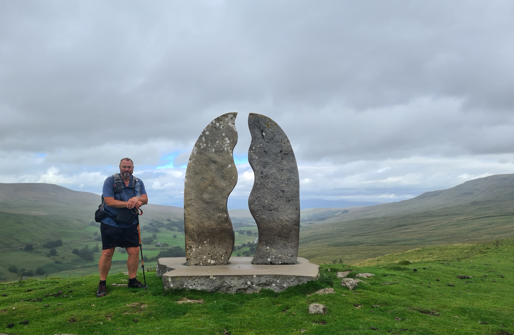 When I reached the Watercut sculpture I obviously took time out for photos. I posed for the camera, watching the rain beyond it making its way up the valley toward me. It eventually caught up with me a quarter of a mile further on but simply splattered me a bit, passed and moved on ahead. That was the last of the rain I was to see on this trail. Lamenting the end of this lovely section, I began my steady descent down to the road in the valley bottom, there to turn sharply left and walk back down it until another turn off for the climb back out of the valley on the far side.