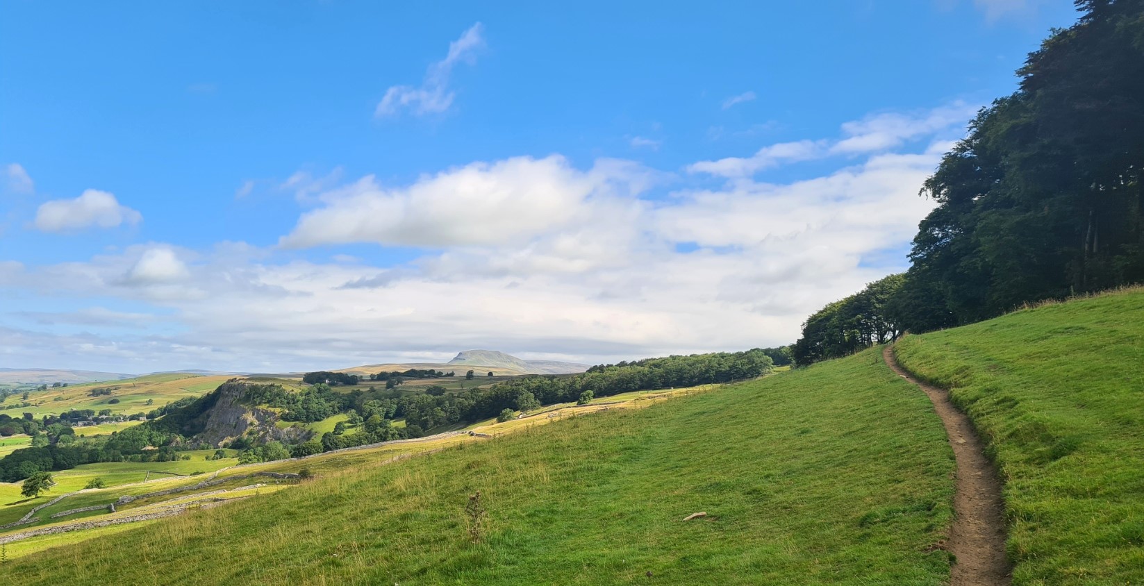 Once Settle’s boy racers had got bored and gone home, the road outside my open hotel window finally went almost silent and I slept well in a comfortable bed. I was up six hours later at seven-thirty to pack before going down for my breakfast an hour later. Sadly, it was a below average quality Full English using sub-standard ingredients. I wished I had instead opted to walk a little way down the road to the Olde Naked Man Cafe that has a good rep for their breakfasts but that would probably have meant a pretty late start to my day. I finally got away from the Royal Oak at nine-thirty and from there it was a steady climb out of Settle back on to the trail. I had the path to myself as most day walkers and cyclists seem to leave Settle by the other arm of the Loop. Once I was at the northern junction waymarker post for the Settle Loop it was then a short section of road walking, only being passed by a farmer moving sheep around in a rattling trailer behind his Land Rover and one other car. It was bright and sunny without a hint of the rain yet again heading my way.