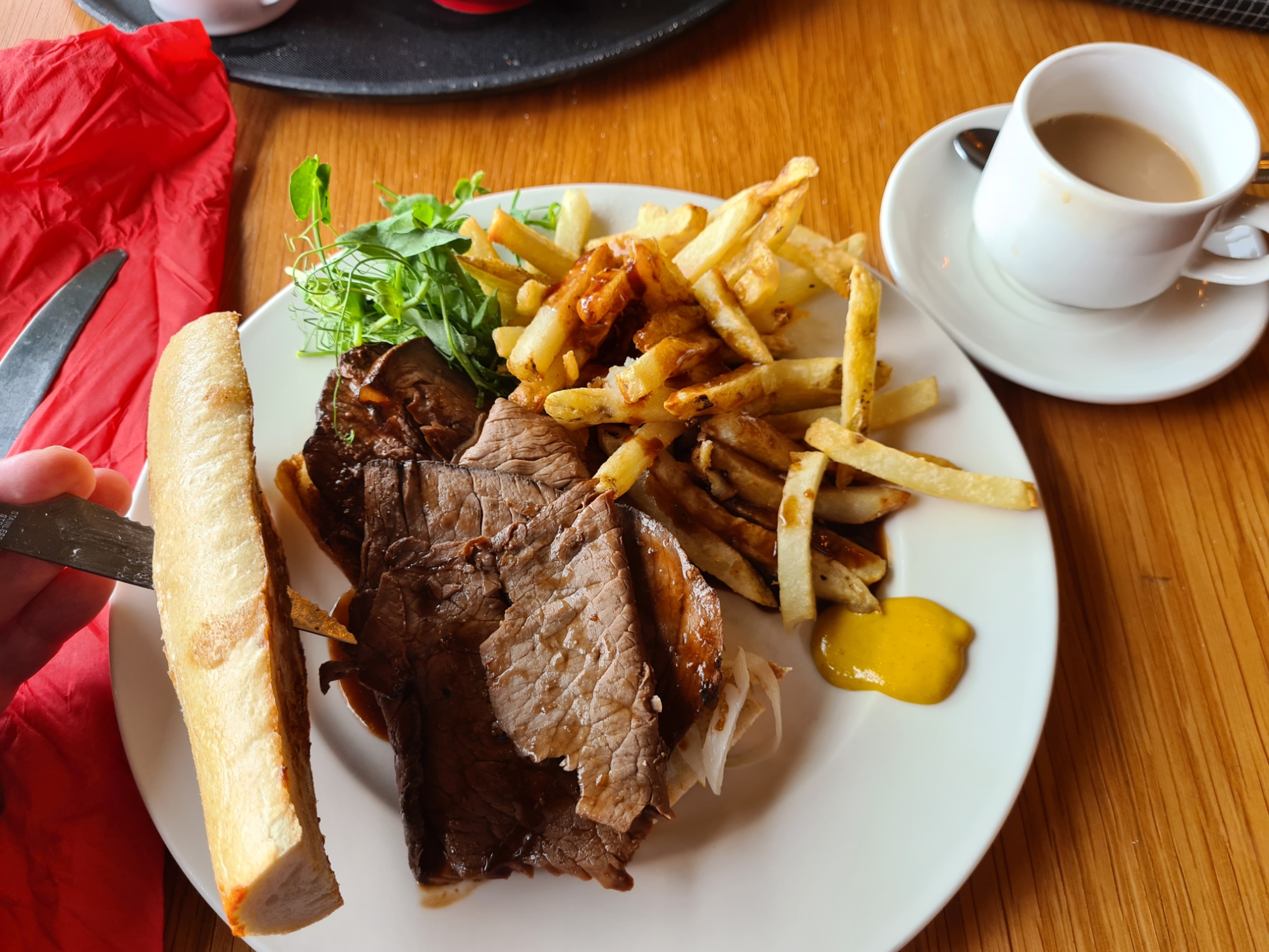 Hot roast beef with chips and gravy at a roadside campsite’s cafe. Little Stainforth
