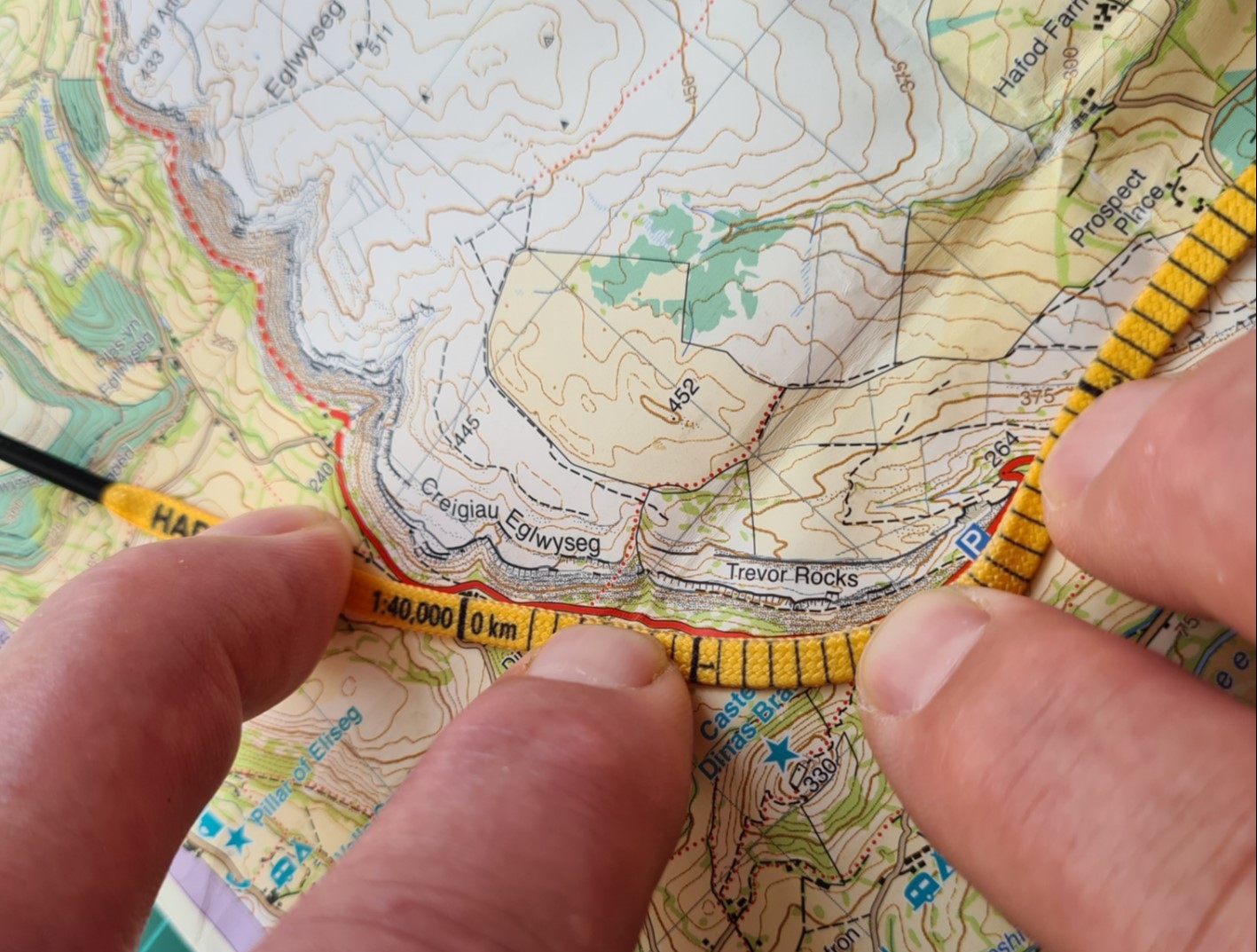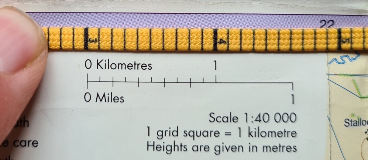 Primarily a lace in purpose, longevity and durability under UV and the rough and tumble of life near the ground in varied temperatures, wet, dry and abrasion were the obvious primary factors to be considered in manufacture. Additional factors resultant from their secondary use as map measures are resistance to stretch, colour fade, print durability and print accuracy. On-the-ground testing was completed by the Harvey team surveying the Wales Coast Path. The flat in profile map-measure-go! laces are 4.5 mm across their width and flexing them around a bend on a map will slightly contract or expand their measurement as a result. A scale of 1:40 000 equates to 2.5cm to 1km, 2.5mm to 100m, 1.25mm to 50m. A scale of 1:25 000 equates to 4cm to 1km, 4mm to 100m, 1mm to 25m. From this we can see that just one millimetre error can result in either 40m or 25m error in distance measurement. So, neither lace scale is going to provide an accurate measurement of distance. However, that is not their purpose. What they will give is a fairly good rough guide of distance on the ground. If the user can accept that, then these move up from simply being a novelty item to a reasonably practical tool.
