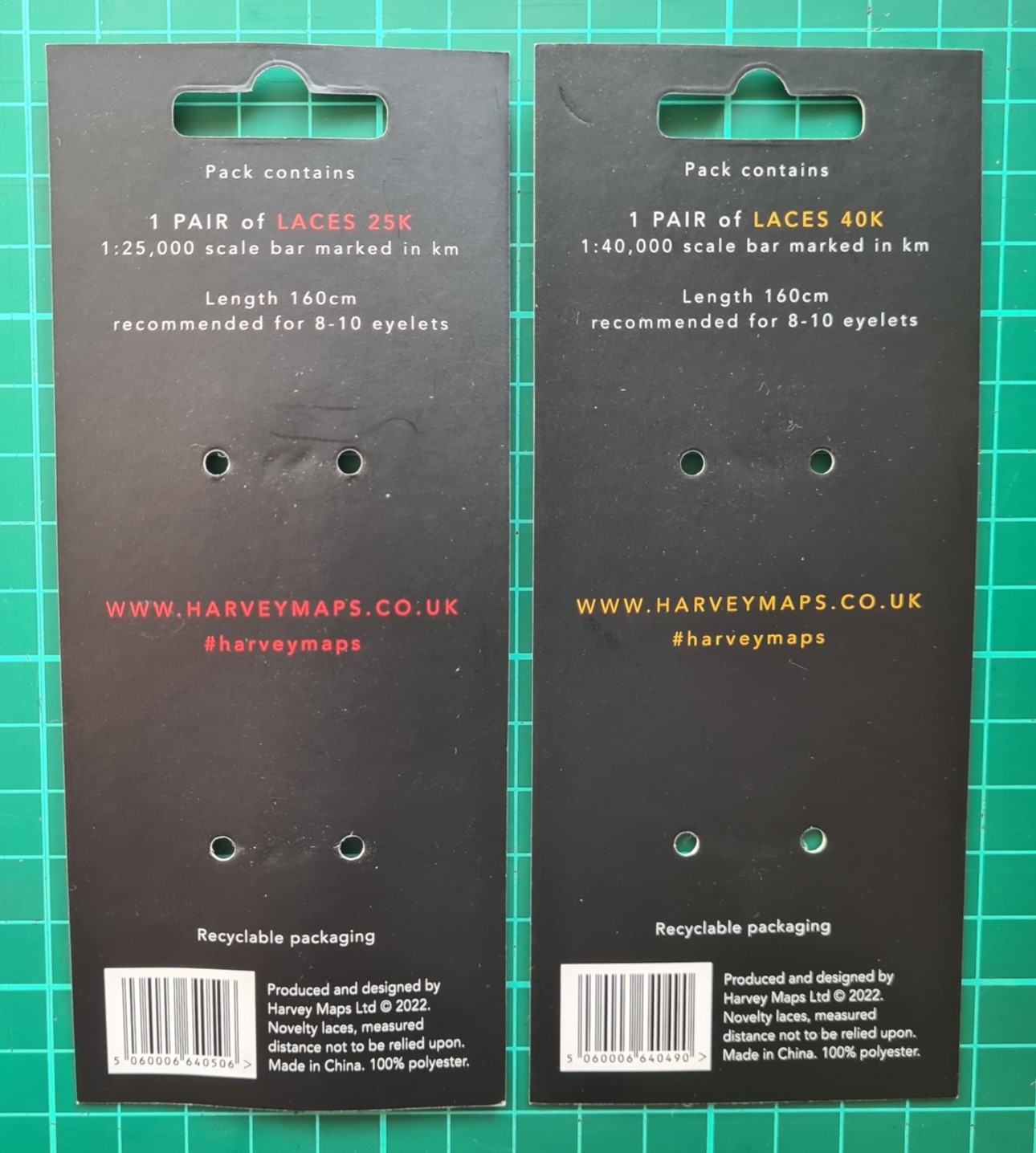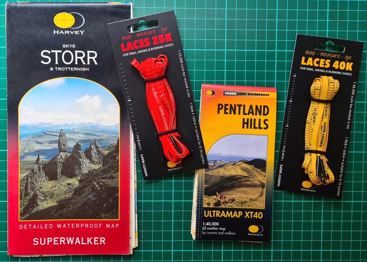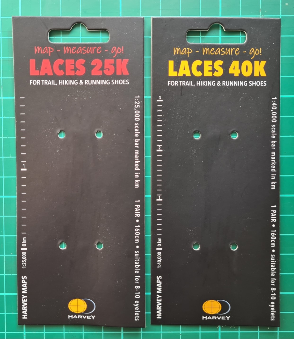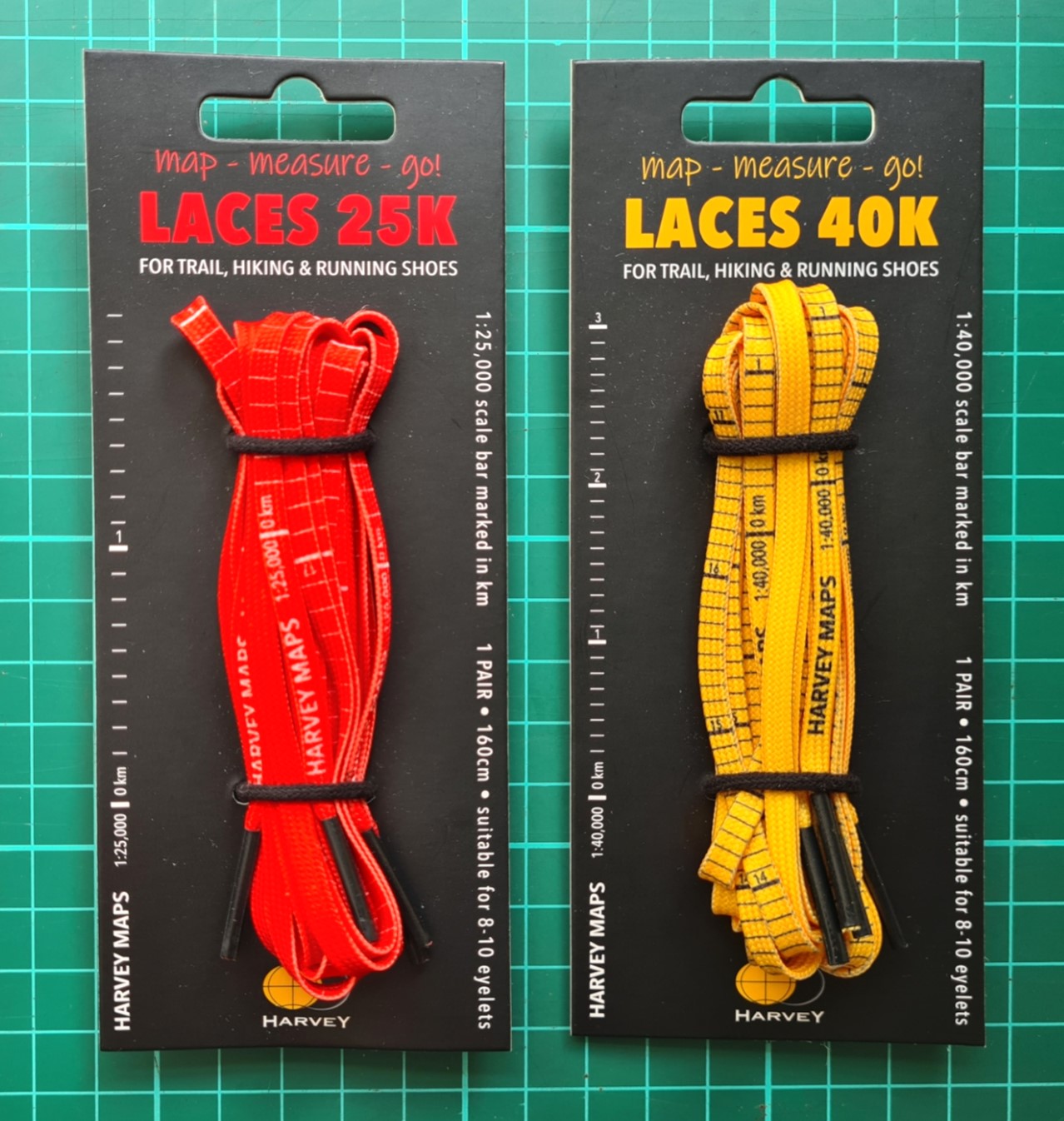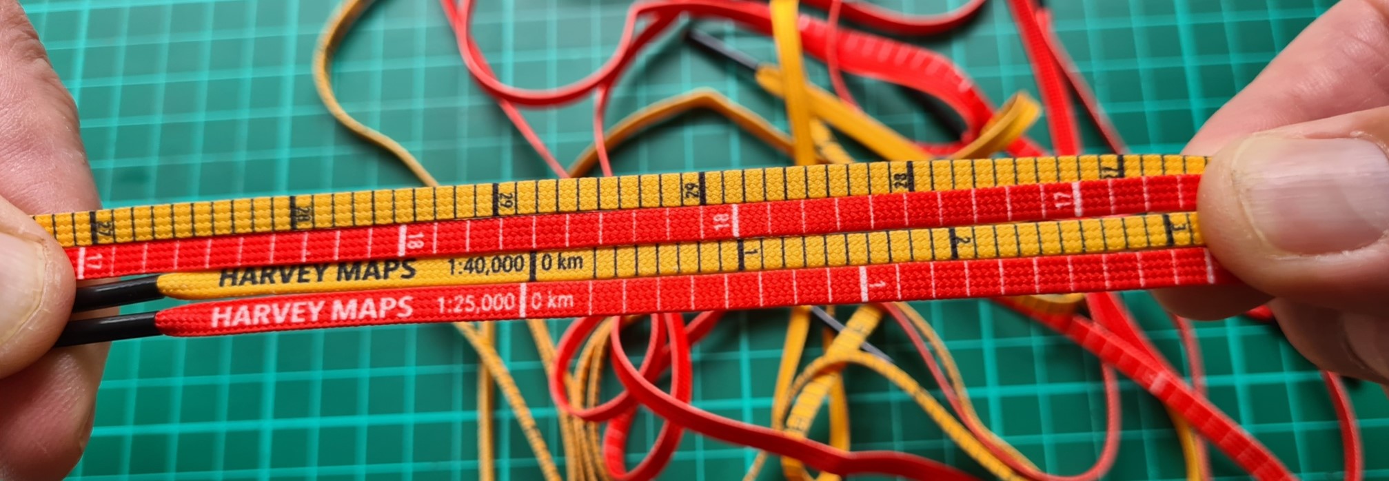 Harvey maps were founded in 1977. Amongst their first products were 1:40 000 scale maps for the Karrimor International Mountain Marathon, now called the OMM (Original Mountain Marathon). A 1:40 000 scale was chosen for this map. This has remained their standard scale and as of September 2022 there were 140 sheets available at this scale. 76 sheets were also listed in their product range at 1:25 000 scale, with maps also produced in smaller numbers at 1:12 500, 1:30 000, 1:60 000 and 1:100 000 scales. It is unsurprising that Harvey chose 1:25 000 and 1:40 000 scales for their map-measure-go! laces. The scales may also suit sheets from other map makers, such as the 1:25 000 scale O.S. Explorer maps.