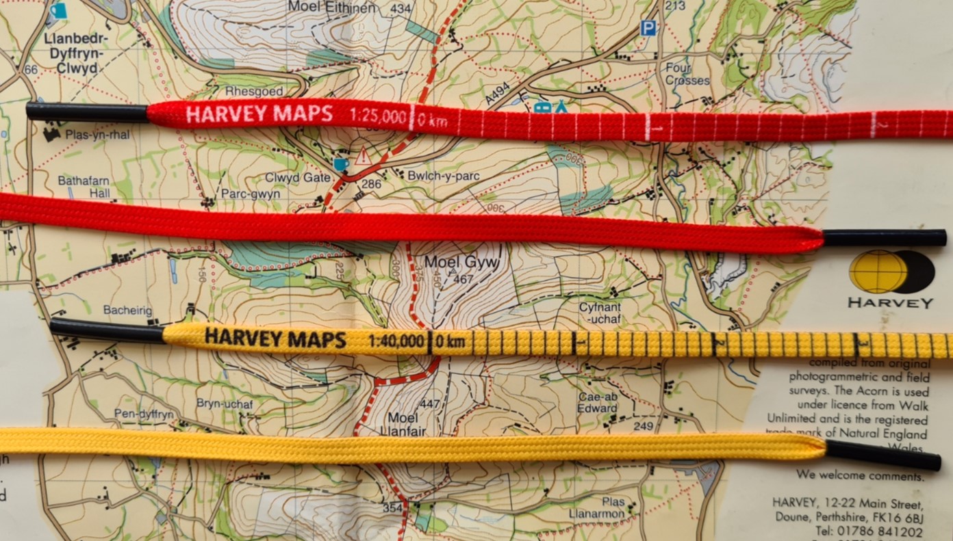 It is not often that a new design of map measure appears on the market. Harvey Maps bucked the trend in 2022 and released a fun little product- boot and shoe laces complete with printed scales to suit their most popular map scales- 1:25 000 and 1: 40 000.