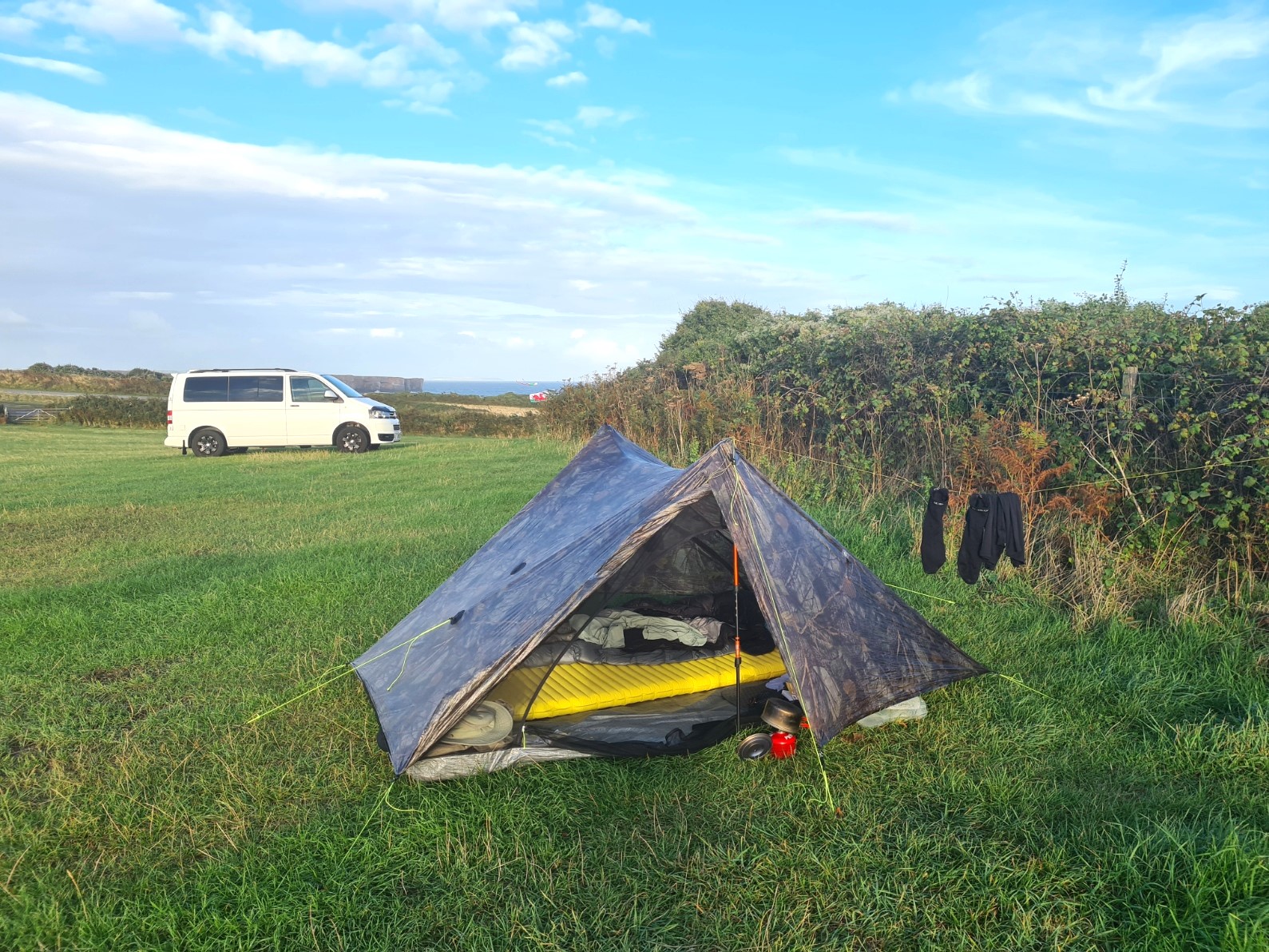 A note from the owners directed me to Trevayne’s large camping field and due to the weather forecast I selected a pitch with the best protection from the wind. However, the wind swung round during the night, and I had plenty of time to wonder if I had made the right choice of tent. Before leaving home, I had debated whether to bring my Duplex, a lightweight and very roomy shelter, or my slightly more cramped Duomid, that would shrug off strong wind better. The Duplex is light and strong, but it is no mountain tent and the increasingly strong gusts buffeting the tent had me leaving the shelter at two in the morning to rig up an extra guy. But it hung on in there and no pegs were pulled, and no damage caused. The morning dawned with wind diminished and too few hours of sleep for me. A few car campers had packed during the night and gone. I chatted to a couple in a large and impressive motorhome. They had dressed at midnight and sat in their rocking vehicle, wondering whether to leave or not.