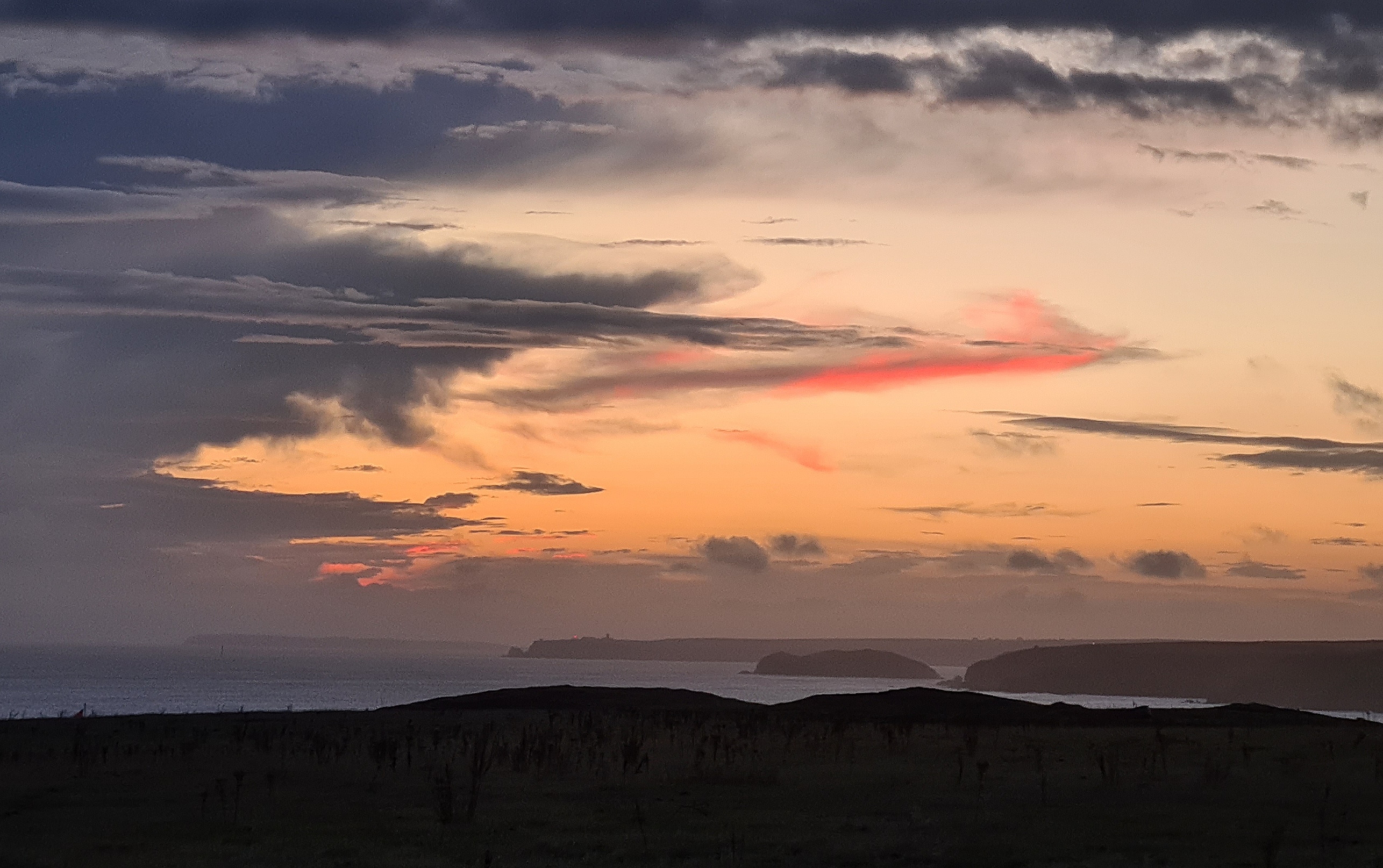 Despite being a late start to my day’s hiking, this was an enjoyable day on the coast and, though getting a little nervous as the sun in front of me sunk to the sea, I still rolled into West Hook farmyard in the early evening gloom at eight o’clock. There was no-one around, it got darker, no-one answered the doorbell or phone. Written notices forbade anyone to pitch without direction. I eventually found an alternative number and the voice assured me ‘no problem, pitch and we will sort it out in the morning‘. The tent was up just a few minutes after the sun had sunk below the sea and a cold wind began to blow in. I suppose with the present energy crisis, I shall have to get used to it, but I found the site a little mercenary with its charging for just about everything. And this after my pitch costing £10. But the shower was welcome, and I was again able to sit in a lit barn to prepare my evening meal and brew.