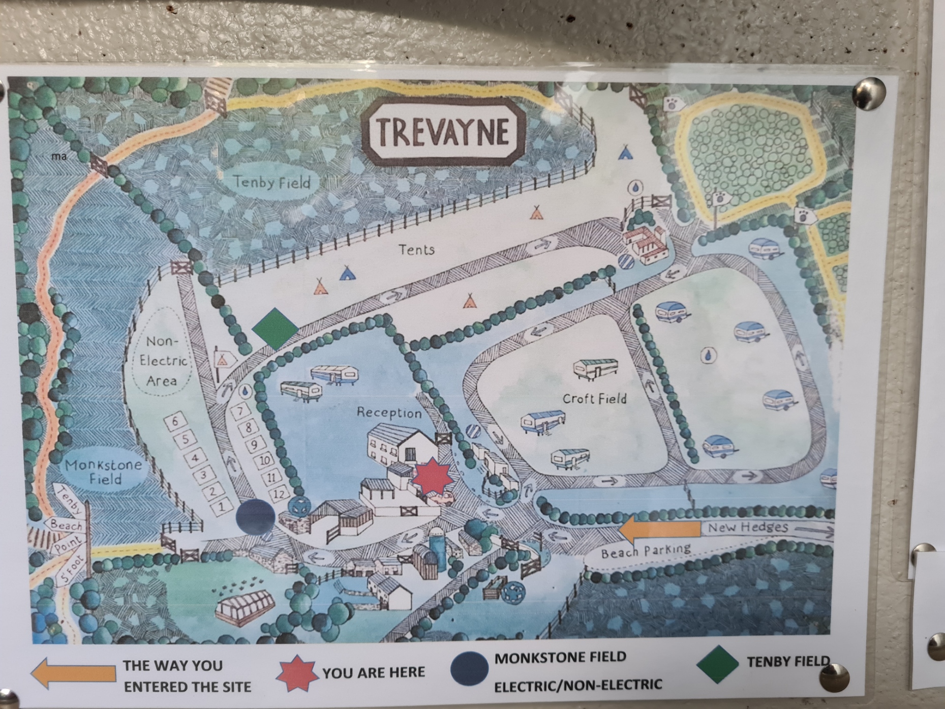 The layout of Trevayne Farm campsite. I had paid in advance and arrived long after receptipon had closed and staff had left. They had left me a note directing me to Tenby Field
