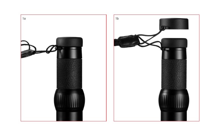Accessories weighing 11g. are included with the Leica 8×20 Monovid on purchase. These are a 7g wrist strap that attaches to both monocular and a 4g plastic protective eyecup cap (there is no cap for the other end of the monocular). The wrist strap has two thin loops at one end. The smaller of these is attached to the eyelet on the monocular, the larger loop is attached to the protective cap. The strap also has a sliding toggle to be tightened against the wrist to stop the monocular sliding off unintentionally. Together with the monocular, these three then total 120g.