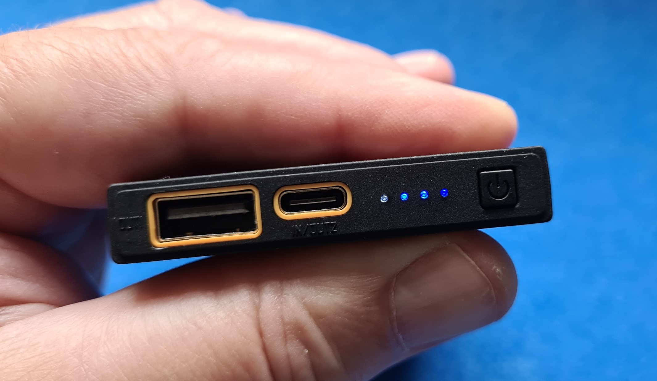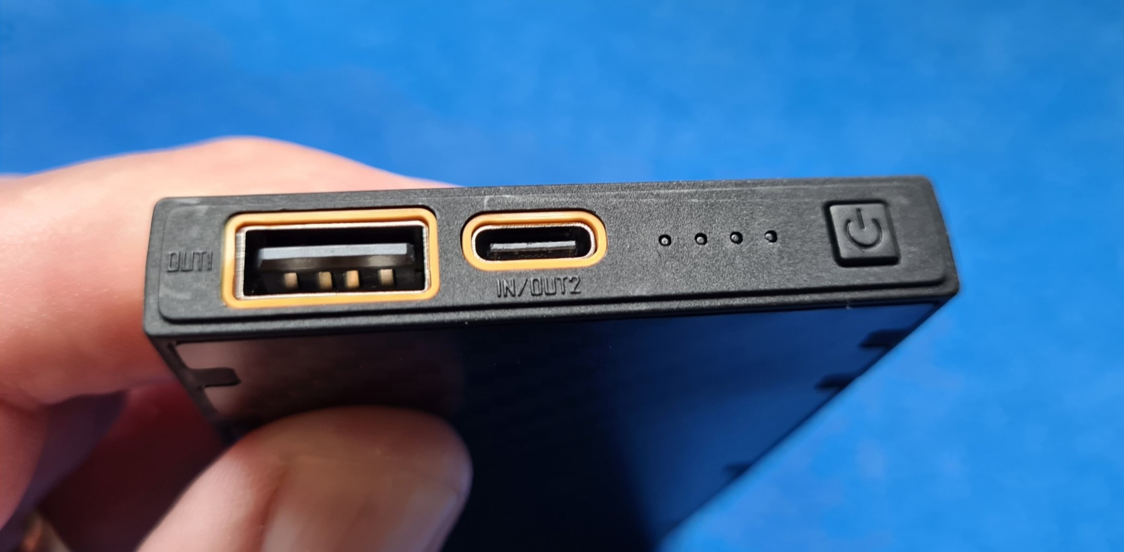 There is little information on the sides of the powerbank and what there is, is black on black and in tiny lettering and figures, not at all easy to see. The business end of the powerbank has slight changes and has been toughened up a little. A power button, LEDs and two charge ports. A USB-A ‘OUT 1’ and USB-C ‘IN/OUT 2’, each with a yellow surround which can aid in orientation in dark conditions. These ports have no rubber protection and are rated IPX5 (IP = Ingress Protection). The X signifies that there is no protection against dust and the 5 tells us that there is only slight protection against water. Nitecore advertising tells us that the powerbank is- “fearless of the rainy or snowy weather”. I wouldn’t go that far considering its modest protection from water ingress. It’ll probably handle a bit of light drizzle but beware heavy rain. If the ports do get damp, the limited protection should protect the internal circuitry, but it cannot be used for charging. Keep this powerbank in a ziplock or better if venturing out on trail to keep it isolated from rain and dry it out thoroughly if ports get wet prior to attempting to use it.